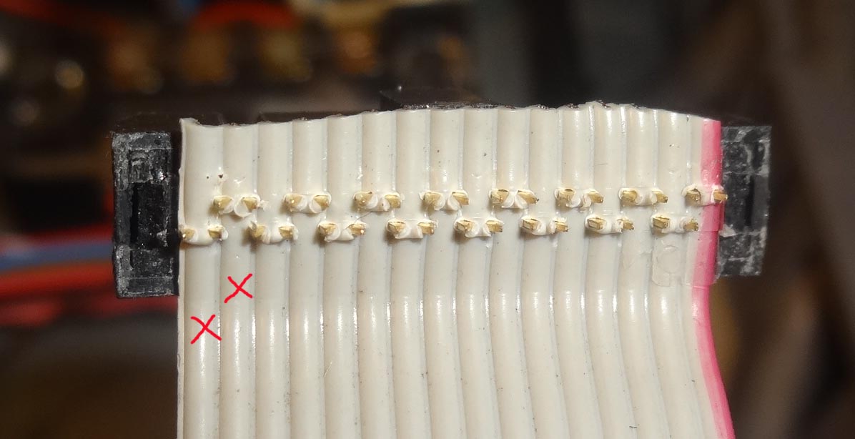 на вид разъемы на шлейф нормально сели и торчащие железки что прорезали жилы не звонятся, но со стороны отверстий если вставить иголки явно прозваниваются два пина. с обратной стороны шлейфа эти пины не звонятся. эта нехорошая сторона шлейфа как раз втыкалась в кфлоп. если прозванивать со стороны плохого разъема шлейф, вторая сторона которого воткнута в платку то тоже некоторые пины звонятся, но видимо, так и нужно.
