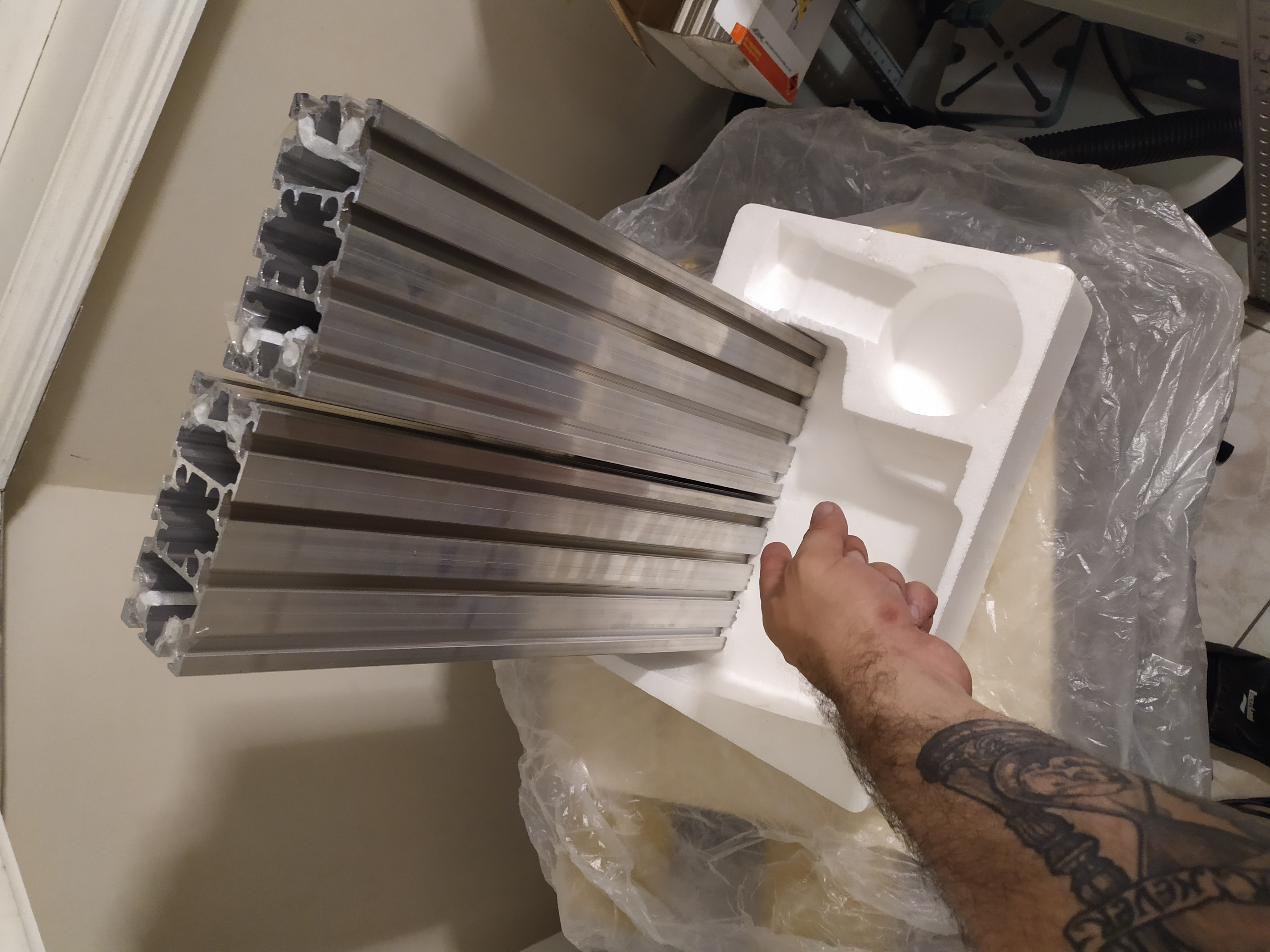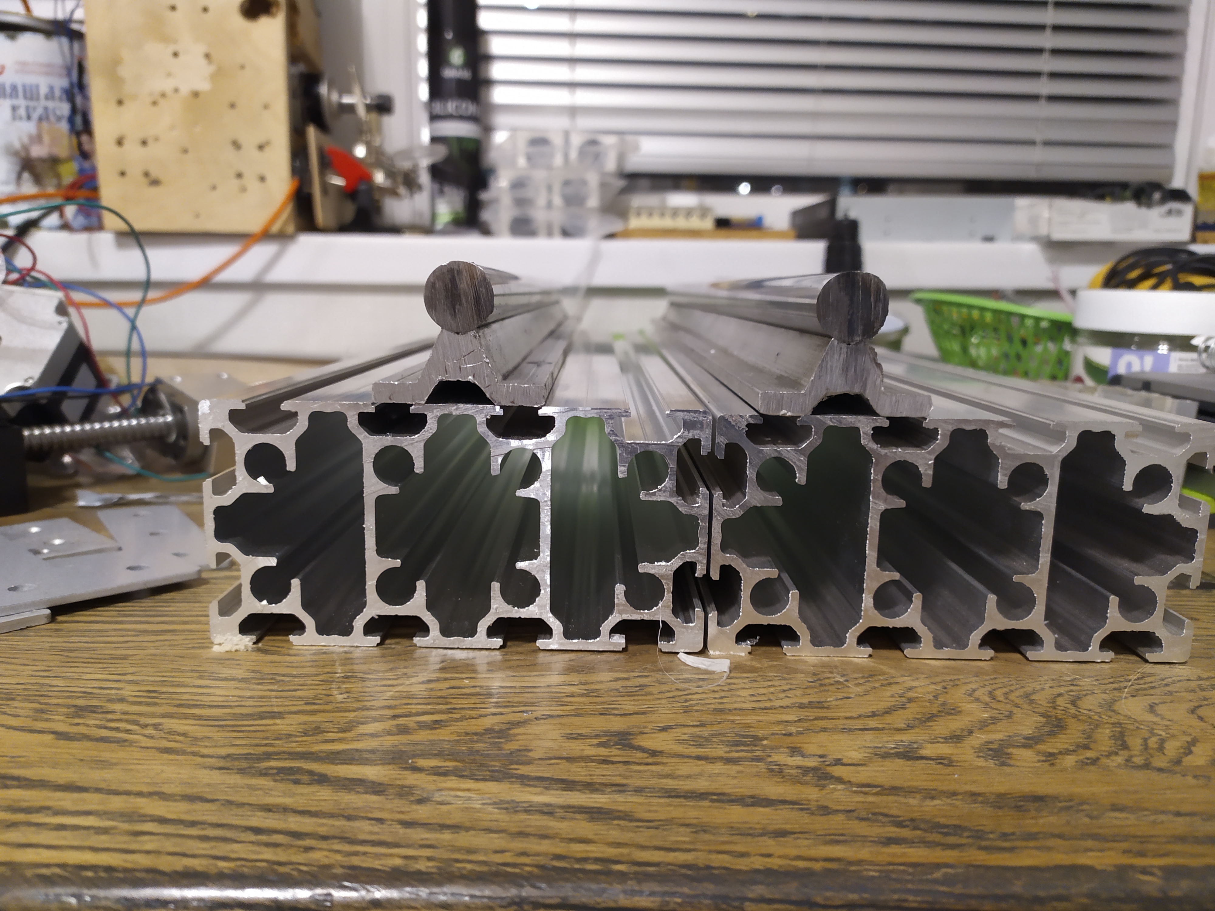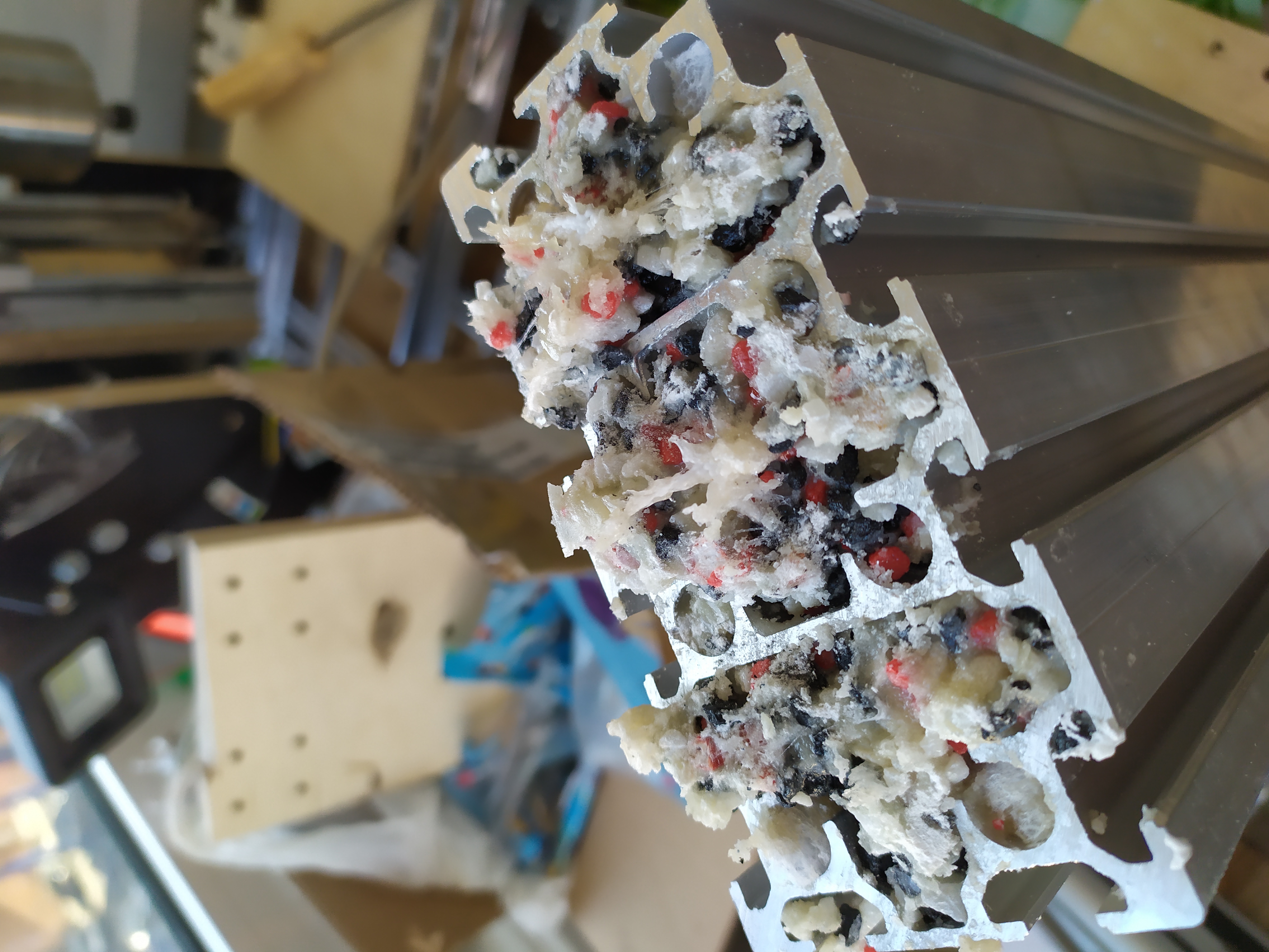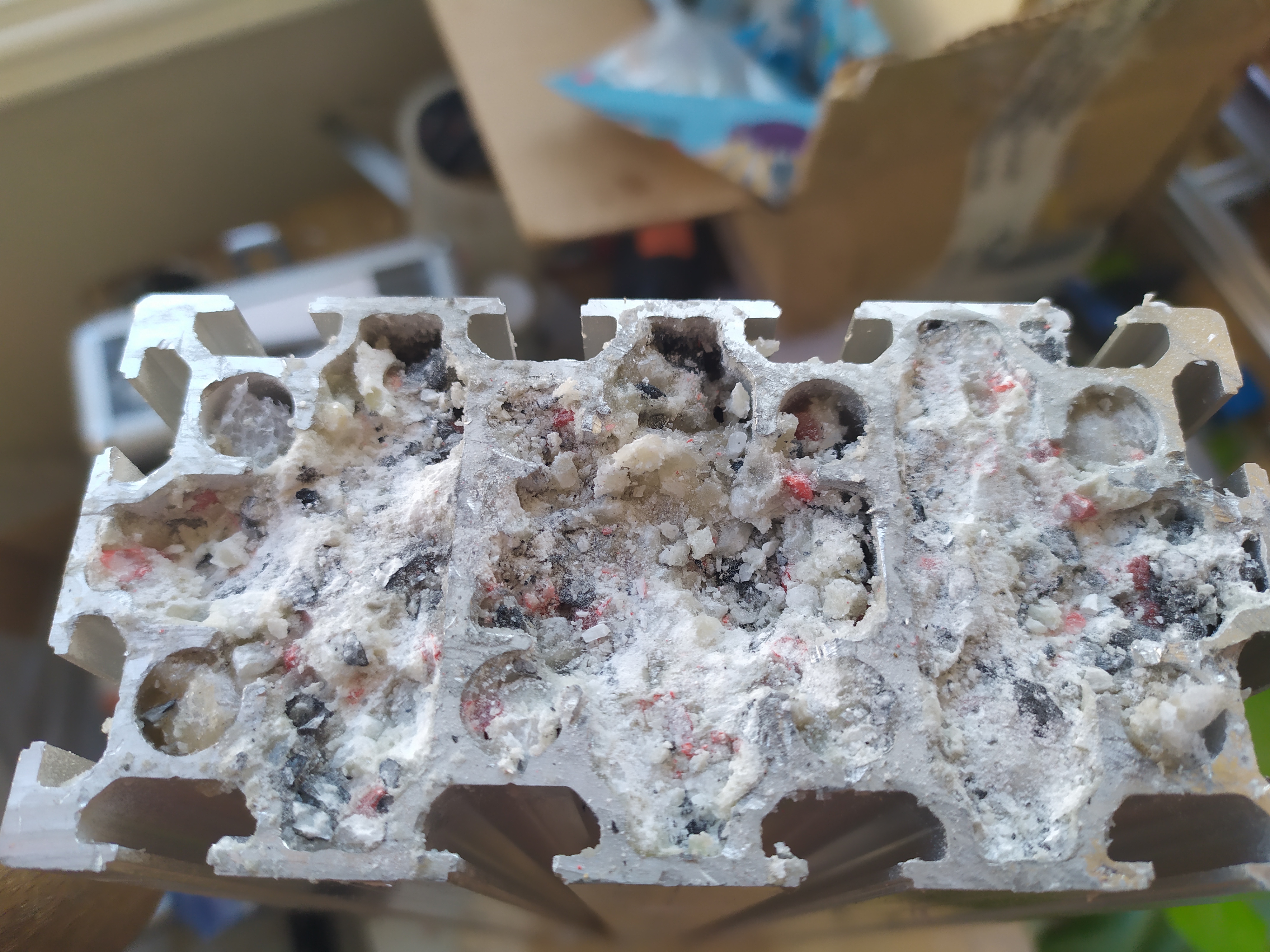 Ну а что, сделал толстый слой, немного сверху надавил торцом и и затем в морозильник. После морозильника, пластилин твердый будет, и можно спокойно засыпать смесь. А отверстия в профиле (видите на фото, вдоль отверстия идет разрез, в который смесь набьется) заклею сантиметров на пять вдоль профиля изнутри просто скотчем, вставив всю ту же пробку из пластилина где то на глубине 5 см. Когда буду нарезать резьбу, скточ не помешавет нарезке.