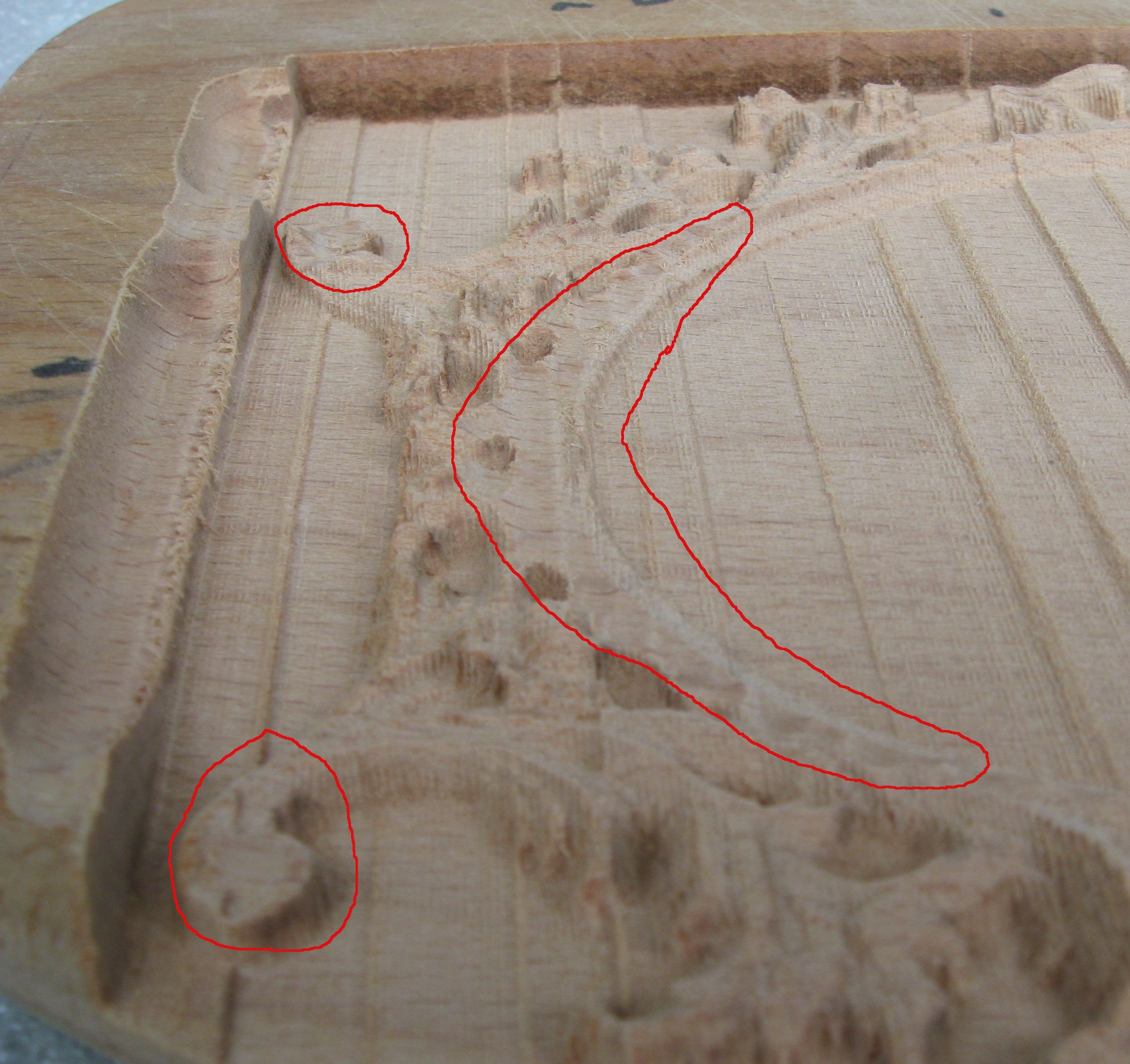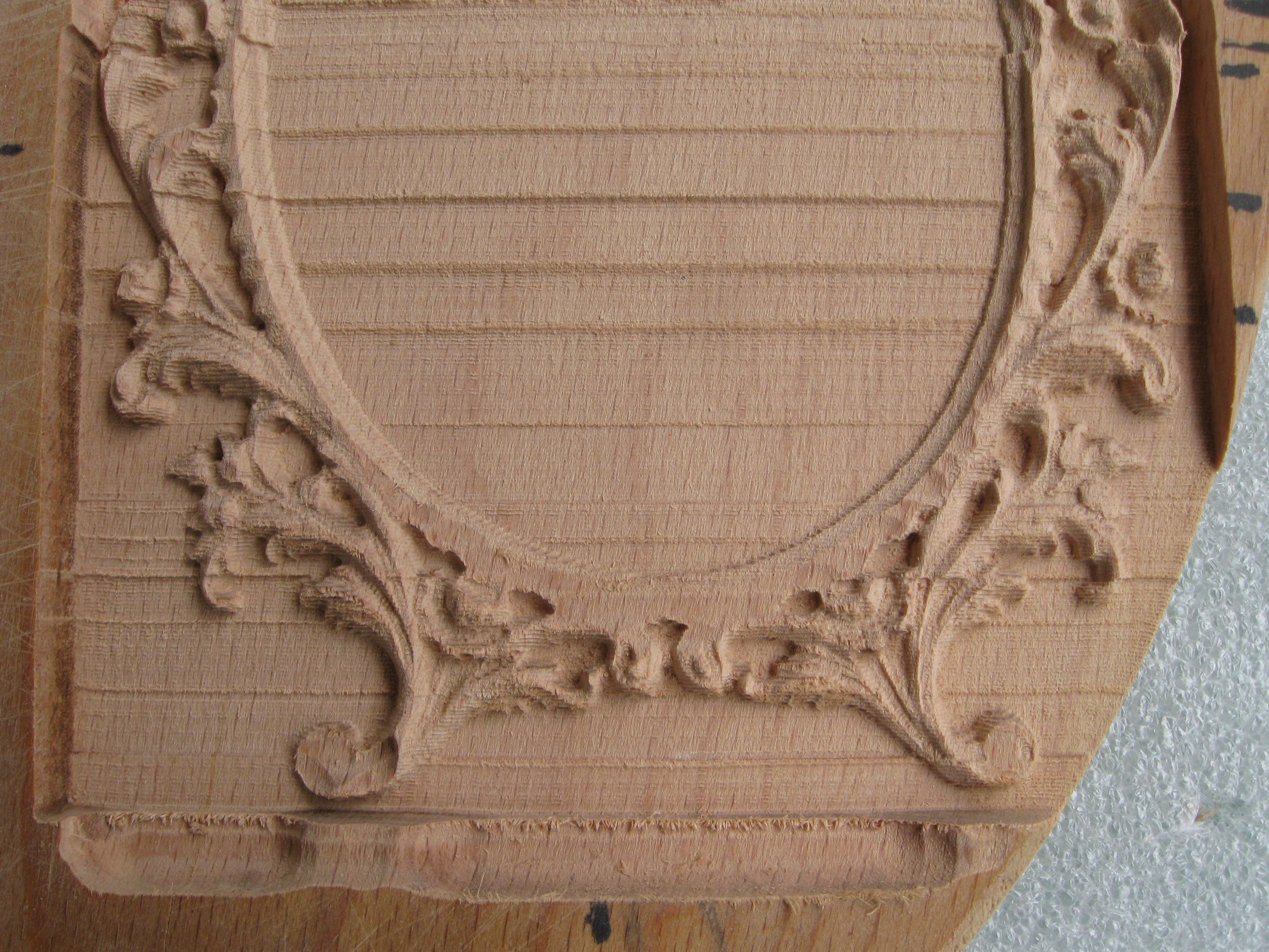 и вот первая работа(правда ей уже 2 месяца): фломастером писал количество часов вырезания за подход, чтобы потом подсчитать общее время вырезания. Сейчас попутались где черновой проход где чистовой, да сейчас это уже не важно уже, т.к. в следующий раз будут другие фрезы и скоростя... высота 190 ширина 125 Для шлифовки шкурка для таких мелких работ не подходит. Я пользовался гравером и циклевал напильниками и ножами...