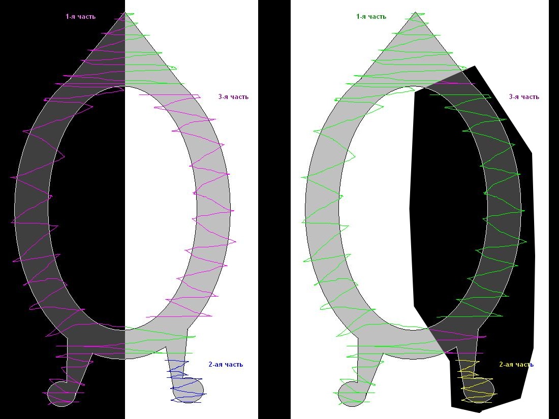 вспомнил зачем: когда по картинке(по точкам) image2gcode формирует программу - он анализирует соседние точки и сглаживает/усредняет траекторию с заданной точностью. Это говорит о том, что в местах совмещения траектория уйдет резко вниз(там же черное, мы же все закрасили) и тем самым испортит заготовку...Nick писал(а):Зачем три части, двух имхо достаточно