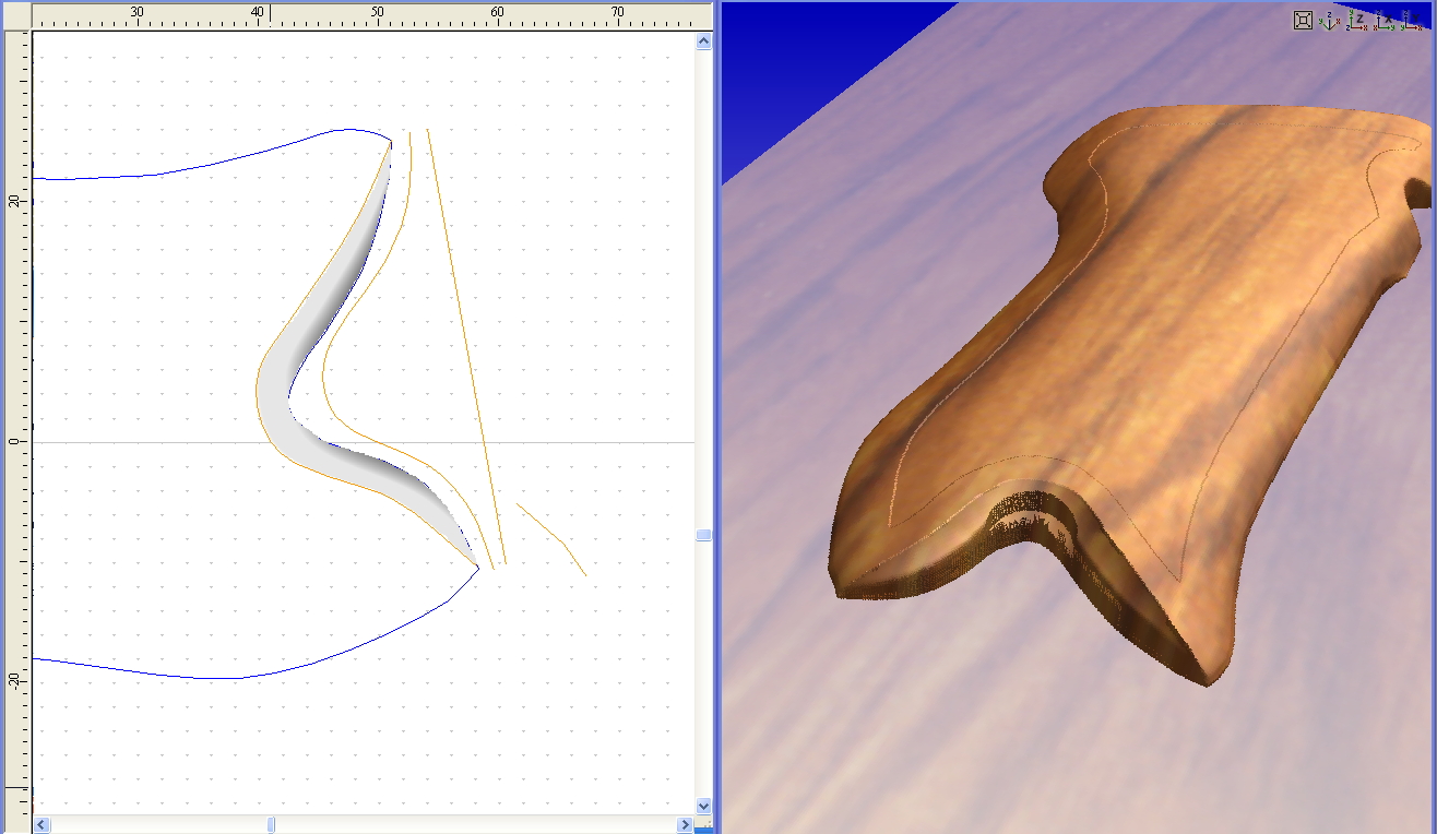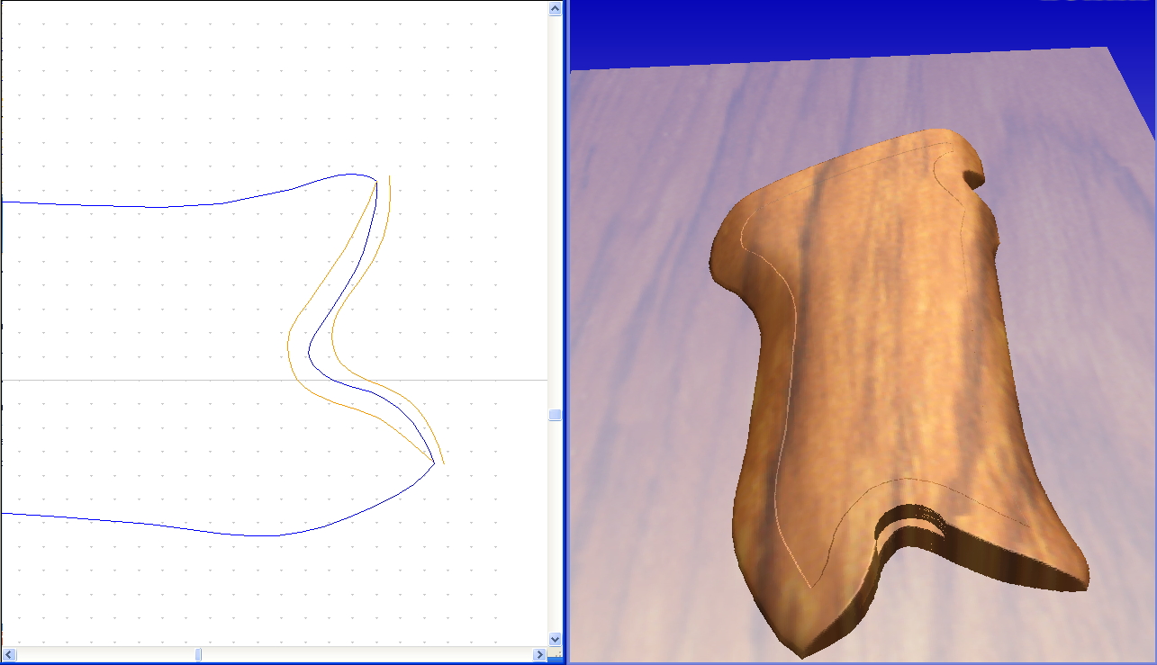 To ampredator: нет.Сначала делаю выборку (типа обработки кормана) рис 1. Потом делаю обработку по профилю с подрезкой углов конусной фрезой, рис 2. Vectric мне делает сразу выборку с подрезкой углов, что мне не нужно так как обрабатываю концевой фрезой. Елозить конусом час только для того чтобы получились красивые уголки как то не кашерно. А найти где обработку по профилю с подрезкой углов что то не нашел. Обратите внимание на верхние уголки букв на обеих рисунках.