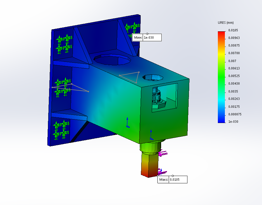 Стенки где то 10, где то 20 мм. Ребра жесткости из 20 мм, плита к которой будут крепиться каретки тоже из 20, остальное 10 мм. Возможно пятку сделаю из 30 мм, 20 мм немного прогибается под 5000 ньютонами) Попробую сегодня еще поутолщать и поуменьшать толщины, посмотрю на динамику изменений жесткости. Ст 3 закладывал, хотя это не принципиально. Делал симуляцию с разными сталями, разбег в результатах мизер. Главное чтоб вариалась нормально.