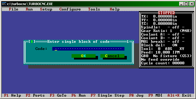 Вообще TurboCNC мне очень понравился, прямо класс! Если бы не одно но, странные задержки при генерации сигнала step, причем такой сигнал явно приведет к пропуску шагов.Вот несколько фотографий-скриншотов, для тех, кто не видел TurboCNC: Забавно при попытки выполнения MDI команды G0 X1000000 (не помню сколько точно нулей, но примерно столько) TurboCNC вылел с такой ошибкой: И еще один завабный скриншот, нажимаю Esc во время MDI команды и вылазит окно: Так и вижу картину,