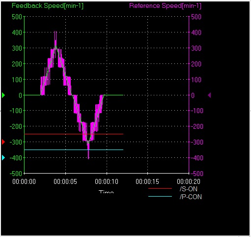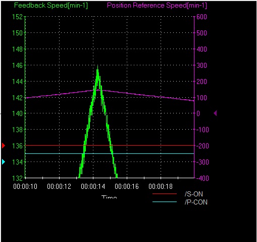 Для экспериментов в Jog режиме проблематично выставить скорость 10 rpm, так как это максимальная скорость, ограничение которой рассчитывается исходя из разрешения энкодера и соотношения электронной редукции. В моем двигателе энкодер 13-битный, т.е. 8192 тика на оборот, поэтому выставить максимальную скорость ниже чем 150 rpm не получается. Поэтому, просто воспользусь длинной фазой разгона до этих 150 rpm, он происходит по линейному закону. Т.е. в Jog-режиме можно выставить время разгона, например 10 сек, и на сервопак будет подаваться управление от 0 до 150 rpm в течение этих 10 сек. Если тревел короткий, то можно разогнаться не боле 10 rpm. Вот так я и сделал. Например, на видео ось ползает на 0.2 мм туда-сюда, разгоняясь к середине пути до 10 rpm.