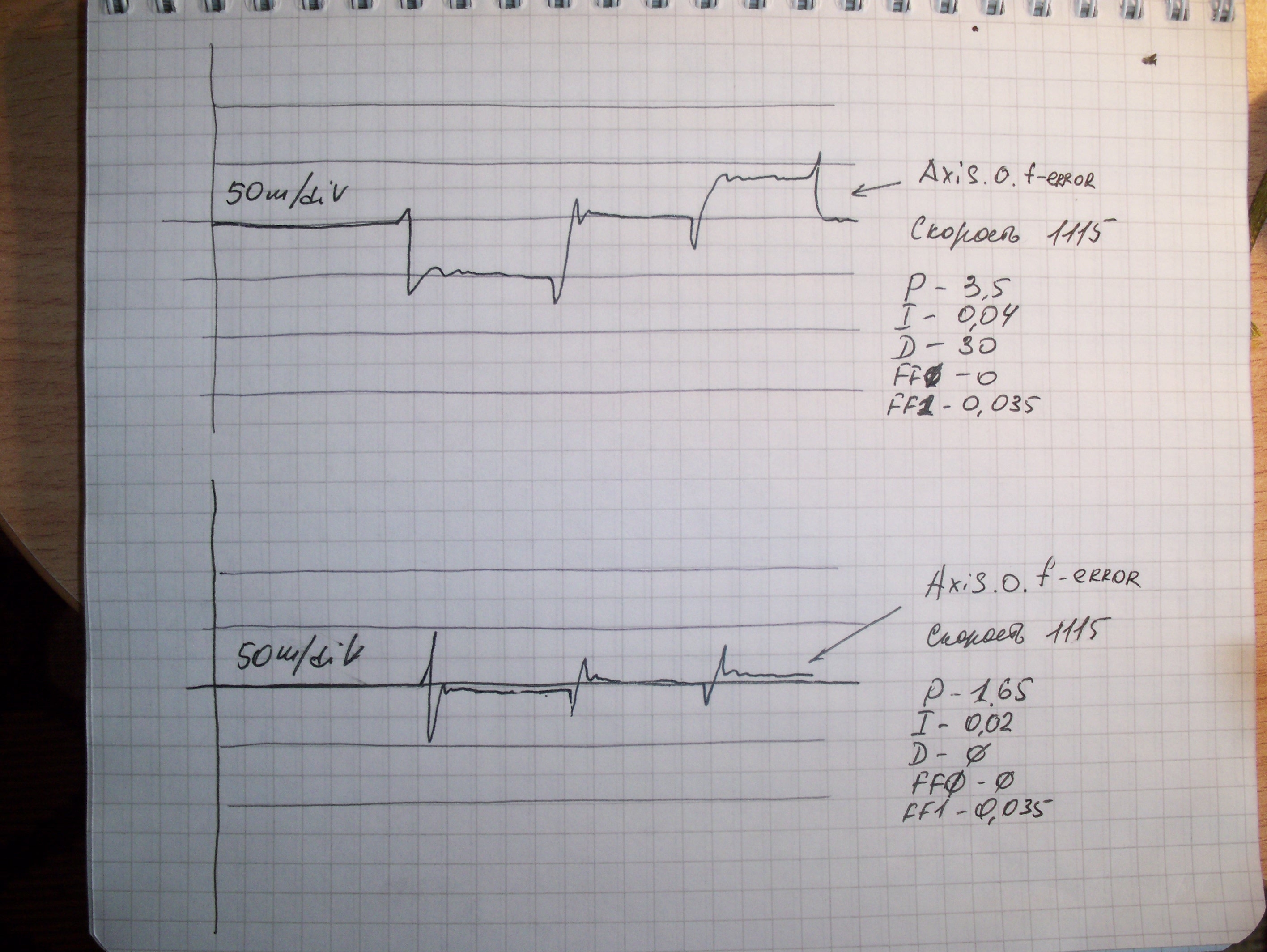 Ну сначала, брали Р увеличивал, пока не начнётся перерегулирование(Р=1.65 - граница), потом увеличивал D чтоб это убрать ну и так далее, причём пока не добрались до FF1 результаты были плачевные. Но только изменили FF1 ошибка резко уменьшилась. Крутили, крутили - всё слабо влияет. Просто когда увеличиваешь Р и увеличиваешь D в режиме удержания достаточно жестко вал удерживается, а если снизить, то очень мягко. Вот я и подумал, что если так сильно влияет FF1, что будет если установить небольшое значение Р, и оптимальное значение FF1. Регулирование достаточно мягкое, при небольшом ускорении.