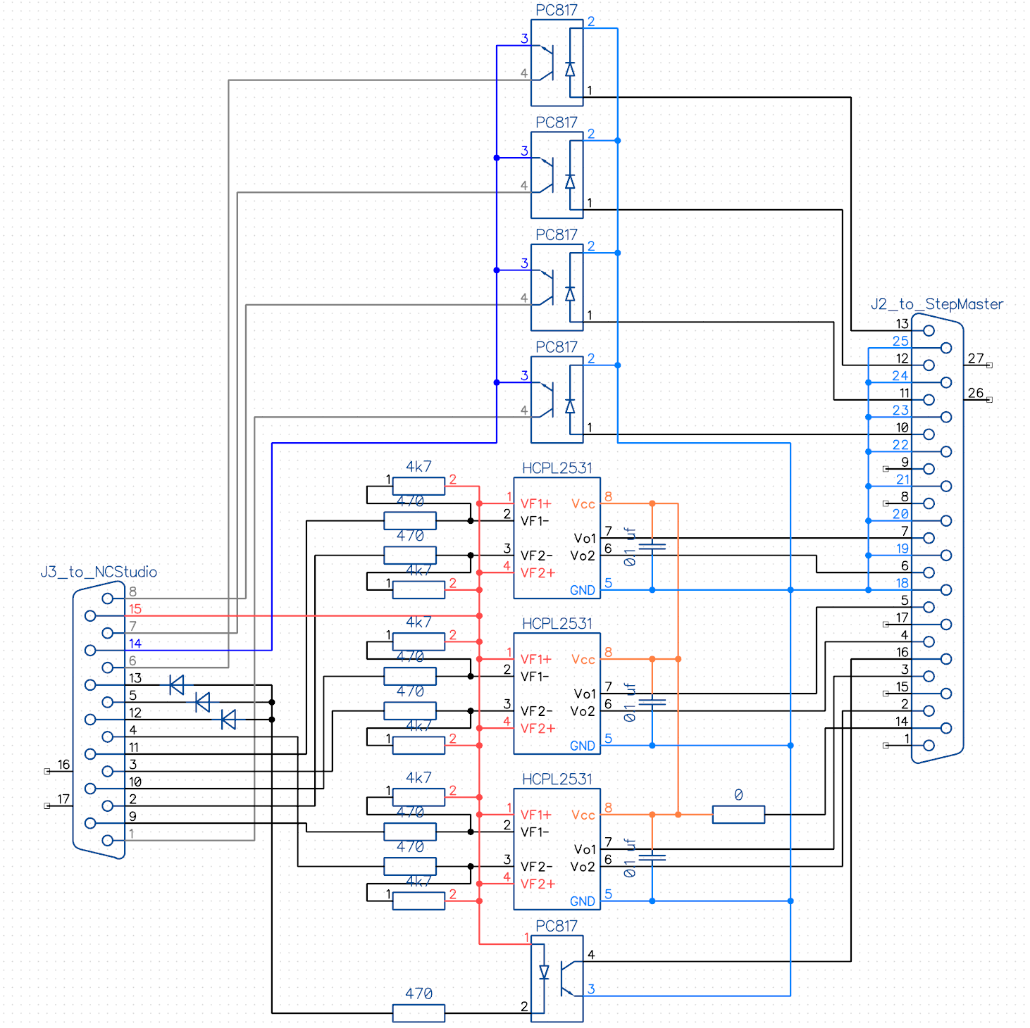 Причем тут земля. У меня все в одном корпусе и на одном шасси крепится. И землю не от чего не отвязывал. Датчики дома в нцшке и от степмастера срабатывали и никаких помех не сеяли. Поэтому вопрос не финансовый а чисто упростить плату переходника. Поставить оптроны только на step и dir. Для того, чтобы координаты не уплывали. Диоды мне например тоже не к чему. Я концы от инвертора на выводы подключаю, а не через реле степмастера.