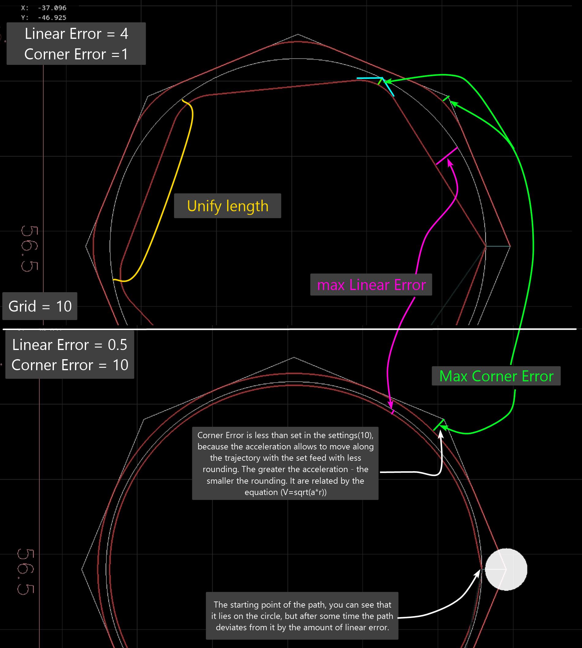 NCstudio вообще от траектории не отклоняется, но при этом, с точки зрения математики имеет бесконечно большие ускорения на стыках сегментов. А в реальности это не мешает работать, и позволяет получить высокую точность и малое время. Но, возникают резонансные вибрации механики станка. Которые можно многократно уменьшить, используя S-ускорения. И во всем этом есть некоторый простор для проектирования. Если не ограничивать себя рамками стандартных решений.