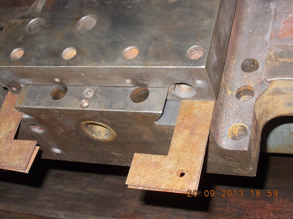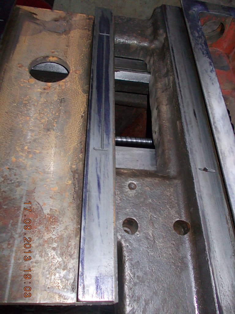 Это после фрезеровки (сняли 1.5мм). Краска только по краям. Видать притянули к столу сильно, когда отпустили суппорт выгнулся. Будем шабрить, на это и рсчитывали. Это после шлифовки Подкладываем пластинки так чтобы клин не торчал из ластохвостов. Так подбираем толщину Zedex. Получилось 2мм. В этом станке направляющие не каленые!