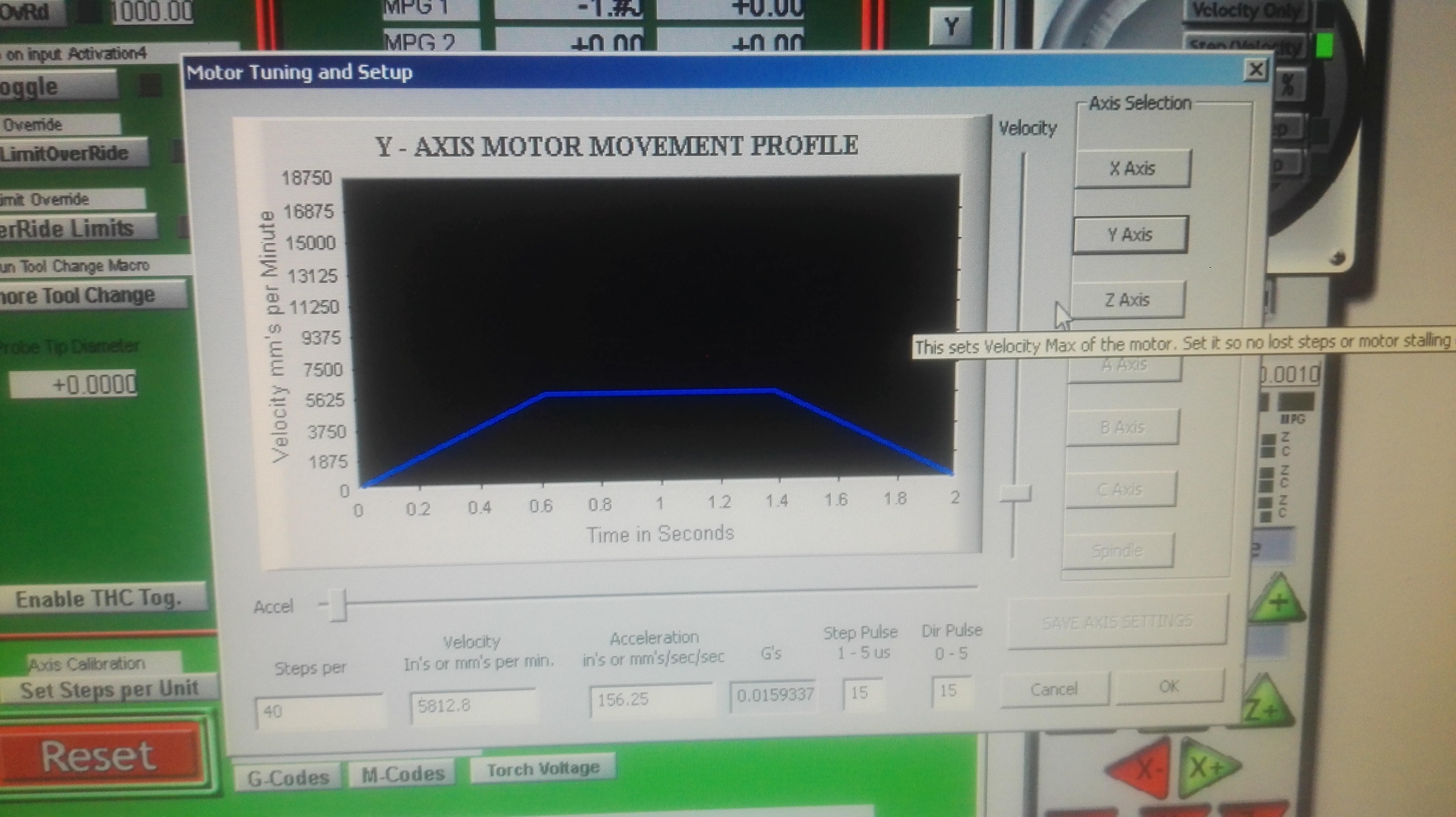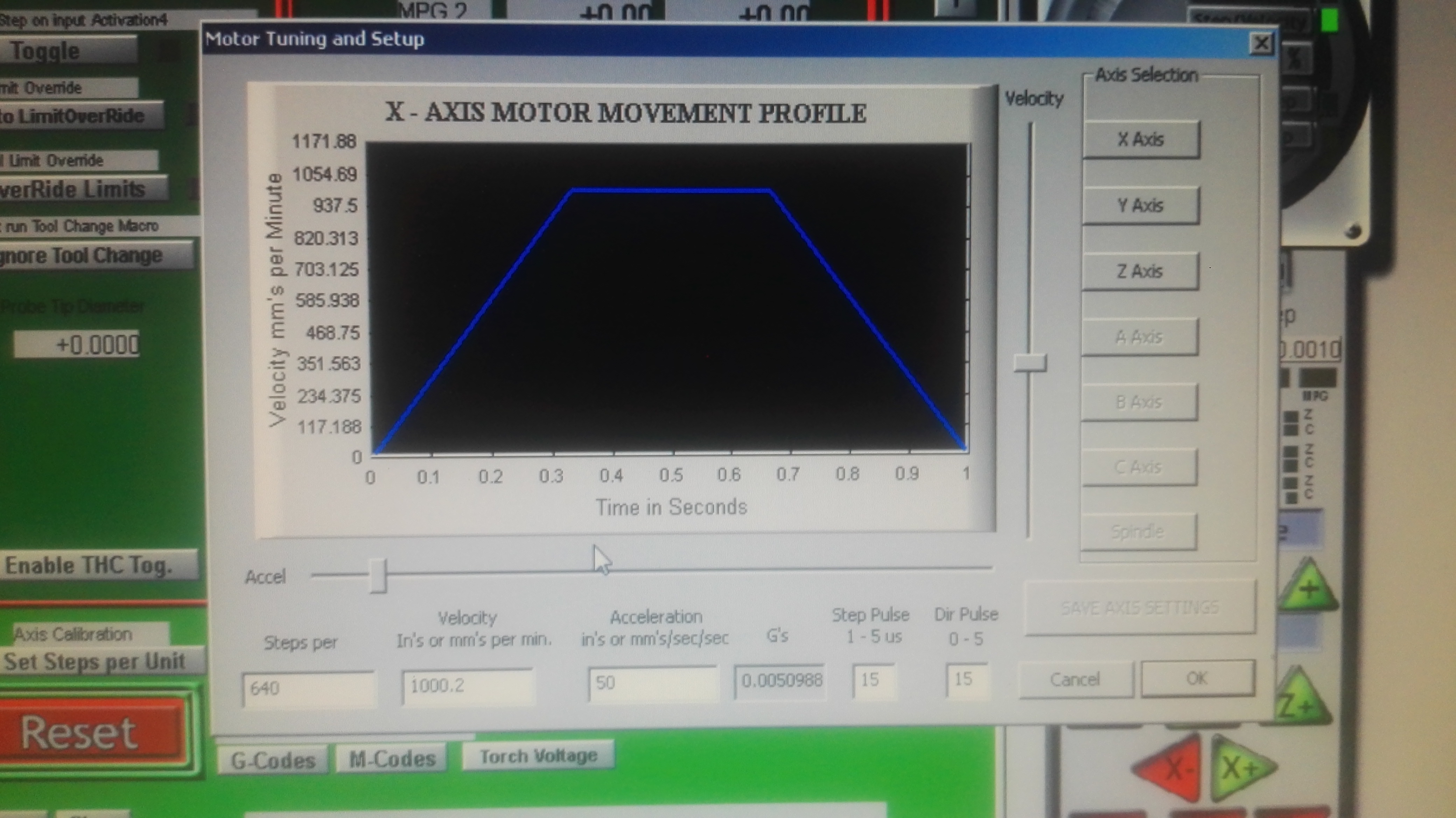 - Ввести в настройки осей MACH3, если на осях ШВП с шагом 5 мм : 160 импульсов на мм, скорость 3000, ускорение 800. Далее в зависимости от того, происходит ли срыв и когда, подстраивать точно. Если срыв при старте, понизить ускорение. Если срыв при постоянной скорости то уменьшить скорость.