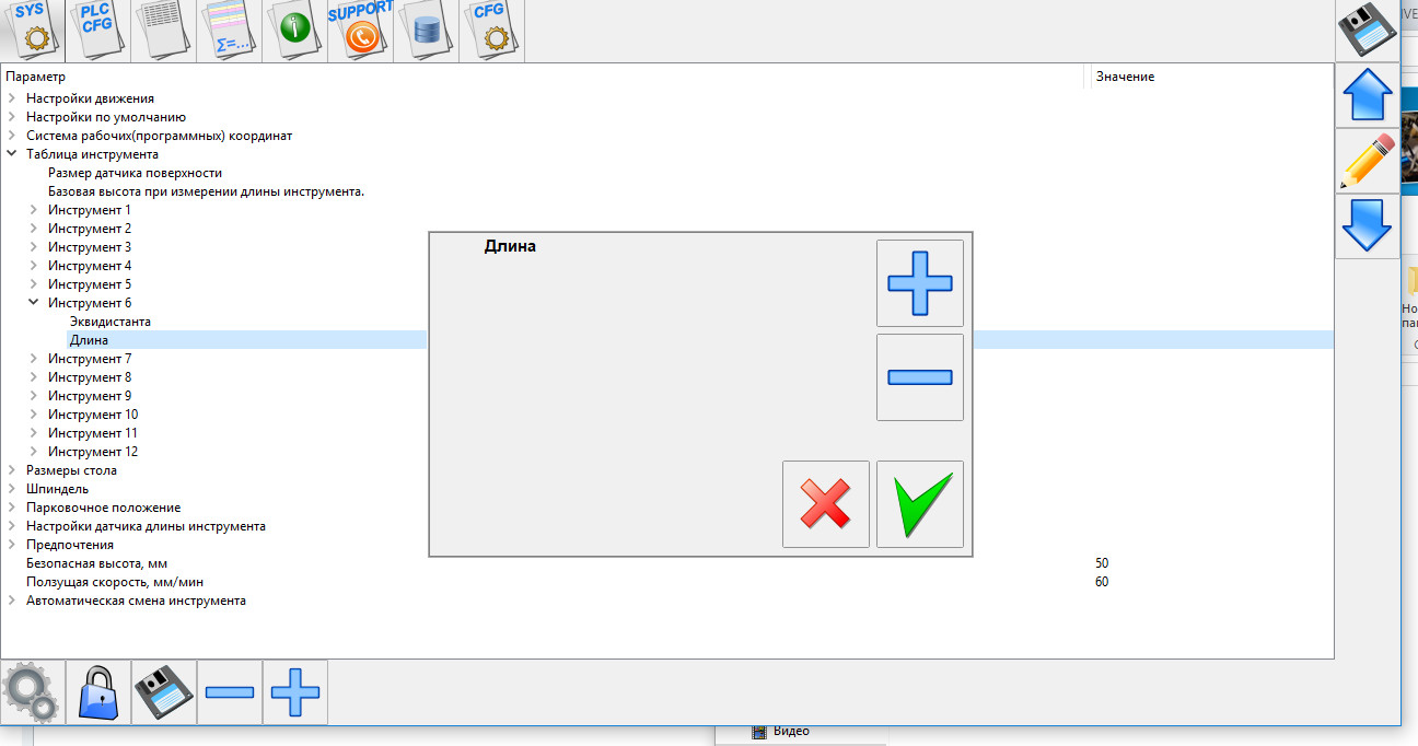 странно, ну а длину инструмента хоть показывает? или пусто? .... я в это место давно не заглядывал ,но насколько помню выбираешь нужный инструмент,затем строку диаметр, жмешь иконку с карандашиком и редактируешь длину........... могу и ошибиться конечно ,года полтора уже небыло необходимости туда лазать......Umnik писал(а):на станке все так же, при нажатии на кнопки нет никакой реакции((