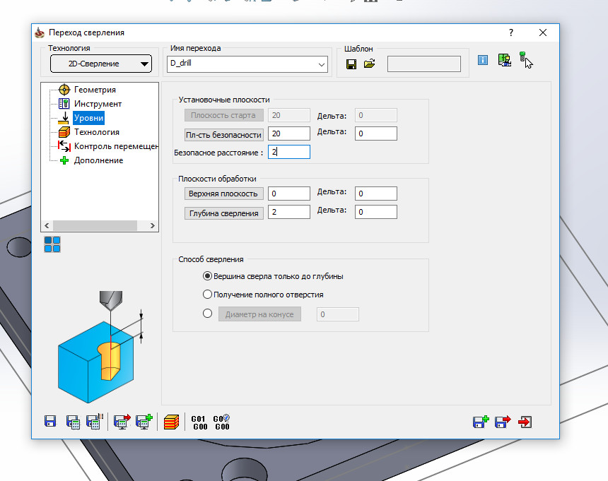 плоскость безопасности задается как приращение от верней плоскости, в том же окне выставлена в 0. в общем случае ноль детали может лежать на столе. внутри детали т.д., так тчо работа идет не от нуля а от верней плоскости.Umnik писал(а):и подскажите еще по солиду, если уж зашел разговор о высоте.