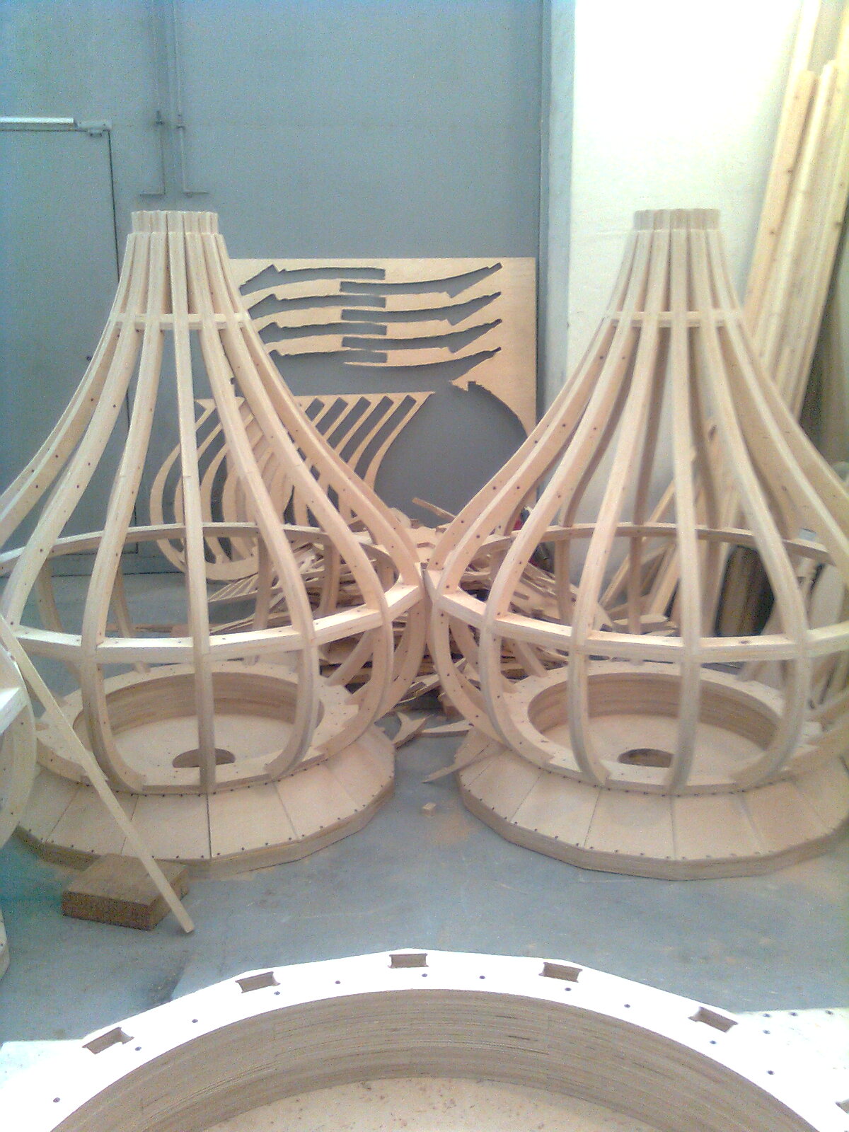 фанера 20-ка и 3-ка . потом прогрунтована в несколько слоев. потом покрыта медью тонкой. потом я еще делал из мдф оснастку для изготовления шпиля. потом ето благополучно уехало в какую то церковь вроде в рязанскую губернию.