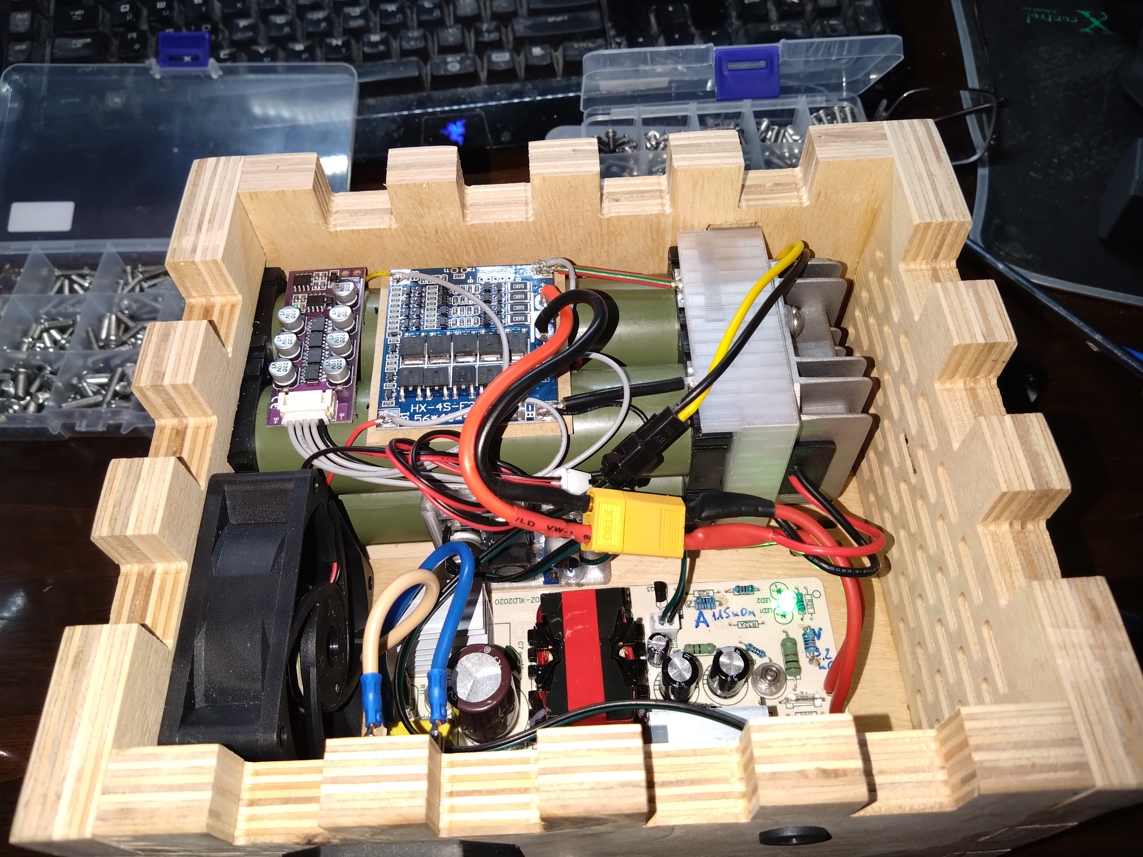 из особенностей уменьшен ток и напряжения зарядного, акумы лифепо4 на 12в 13ач, добавил активный балансировщик, регуль на вентиллятор, на выходе блочек стабилизатор на 12в 3а.