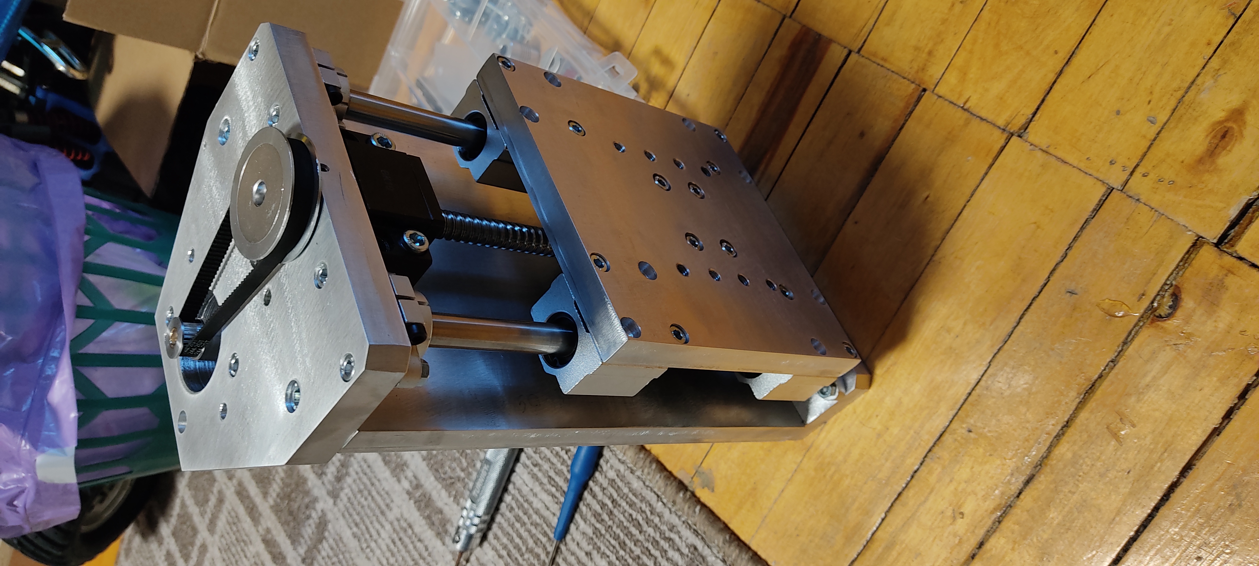 Поставил последнюю каретку и перевтулил шкив с 8 на 6.35. натяжка хорошая. Подвигал ось. Ход получился 70 мм. Плавно. Момент удержания при ручном режиме фрезеровки думаю будет достаточным