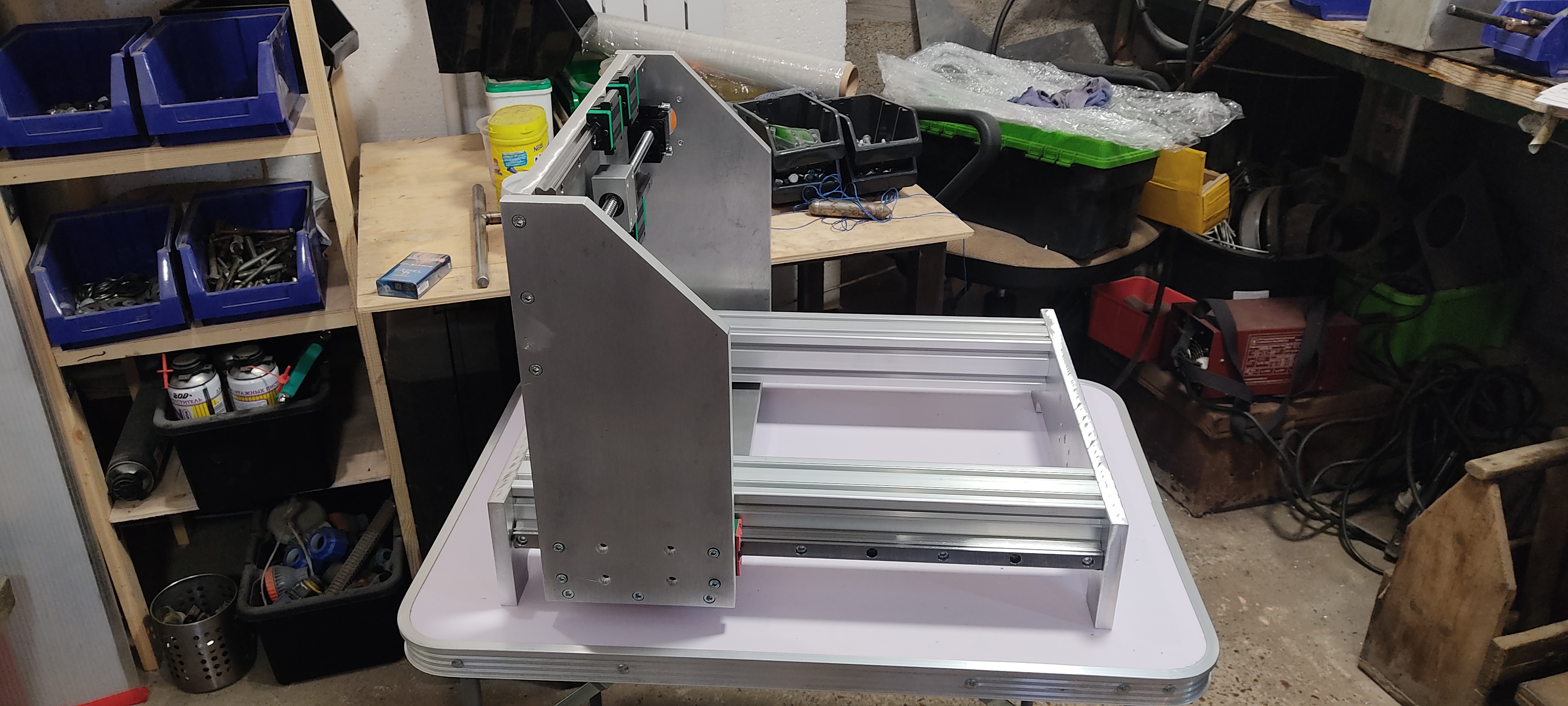 16 шт резьбы М8 в профиле 60*60 и низ основа собрана. Болты пришлось все проточить на станке, также как и болты М6 для крепления рельс к профилю. Собрал все вместе. В местах крепления портала к кареткам зазор как и планировал, лучше зазор выбрать латунной фольгой чем "не влезает")