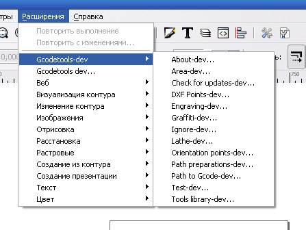После этого в меню расширений inkscape появится gcodetools-dev - там все точно также, как и в обычном gcodetools - только самая последняя версия.