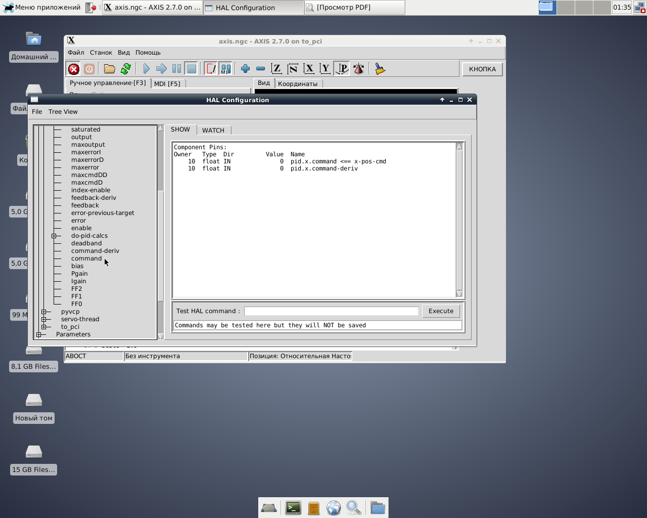 Так же в окне show видно что источником является axis.0.motor-pos-cmd, а приёмником pid.x.command.
