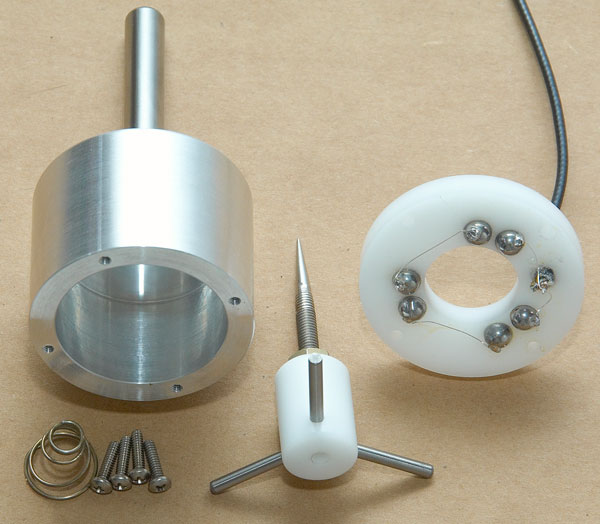 Ну как бы он ничтожно мал) величина пробоя там никакая, да и есть схемы, вроде на ОУ, её нейтрализующие. Во всяком случае это точнее хоббийного станка и изготовления. Три контакта для возможности юстировки. 4 крестом не получится точно выставить, чтобы все шары были замкнуты одновременно, и боковой ход щупа будет меньше - цилиндры будут упираться в направляющие.