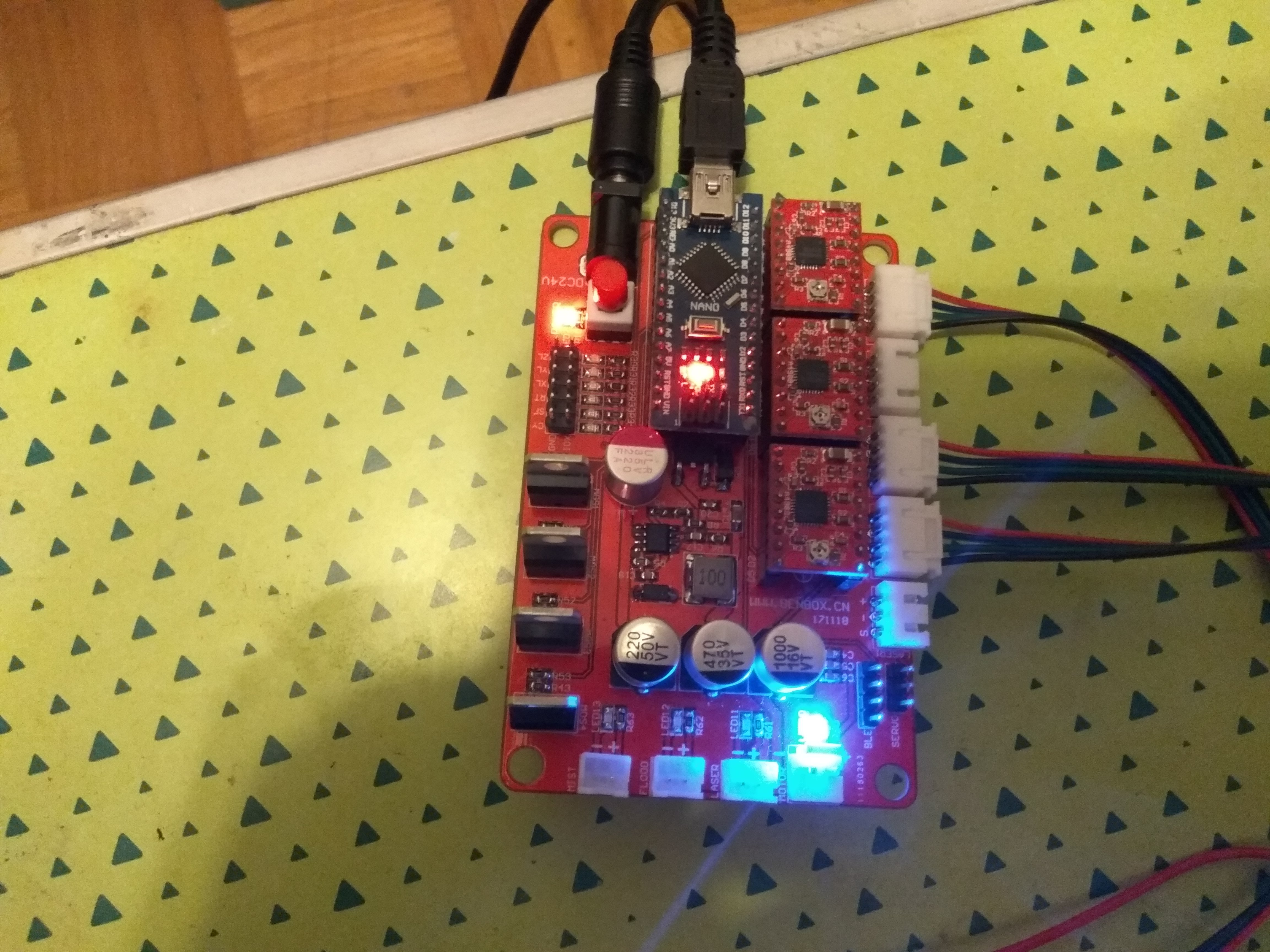 вчера запускал все работало, сегодня разъем фрезерного шпинделя замкнуло штоли( постояяно синим светит на фото) вместо него с помощью "М3" включается разъем ЛАЗЕРА и с помощью "М5" успешно выключается