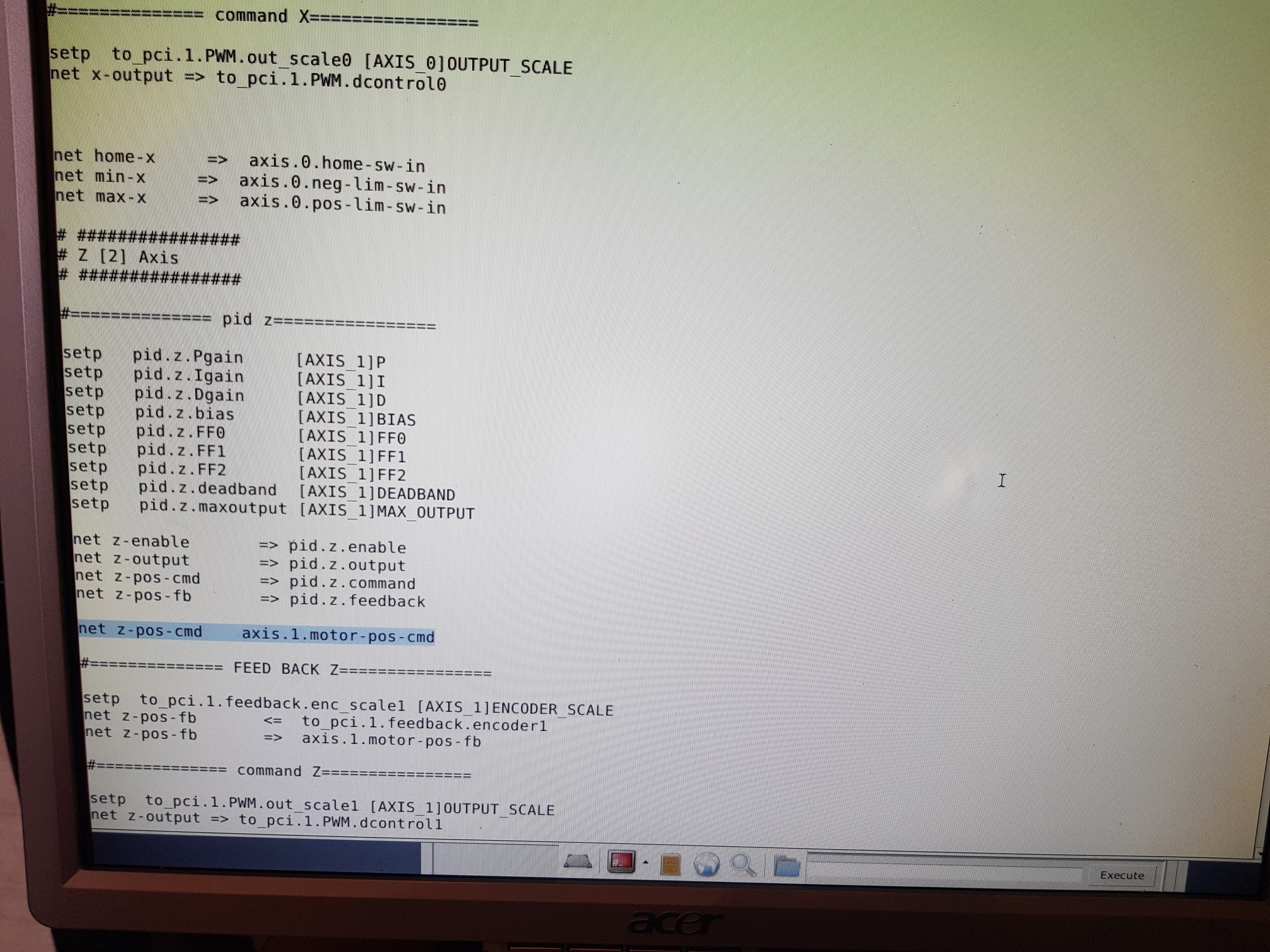Да .Верно . Нашел ошибку. Спасибо.mmv писал(а):На 6-й минуте видео вы показываете что управление идёт осью Z с пина axis.2.motor-pos-cmd. А посмотрите что вы посылаете на вход pid.z. Разве этот сигнал? Все связи каждого сигнала можно увидеть в "Показать установки hal". Проследите что к чему подключено.