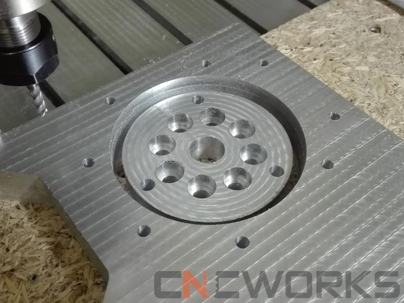 Для получения наименьшего биения патрона на поворотной оси, планшайба протачивается, торцуется сразу на патроне. Т.к. в самом редукторе есть отверстие 20мм и в токарном патроне 20мм пришлось немного поковыряться с изготовлением планшайбы.