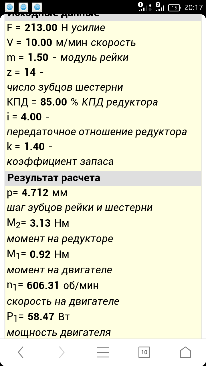 Рейка с модулем 1,5 умножаем на 3,14 получаем 4,71 - ход одного зуба, умножаем на 14 зубов, получаем 65,94мм за один оборот шестерни. При редукции 1:4 оборот двигателя равен 16,485 мм, делим на 200(360:1,8) , получаем 0,3297 мм на один шаг , а дальше дробим по желанию и возможностям компа.Для скорости 10м\мин делим 10000мм на 16,485, получается 606 об\мин на двигателе.