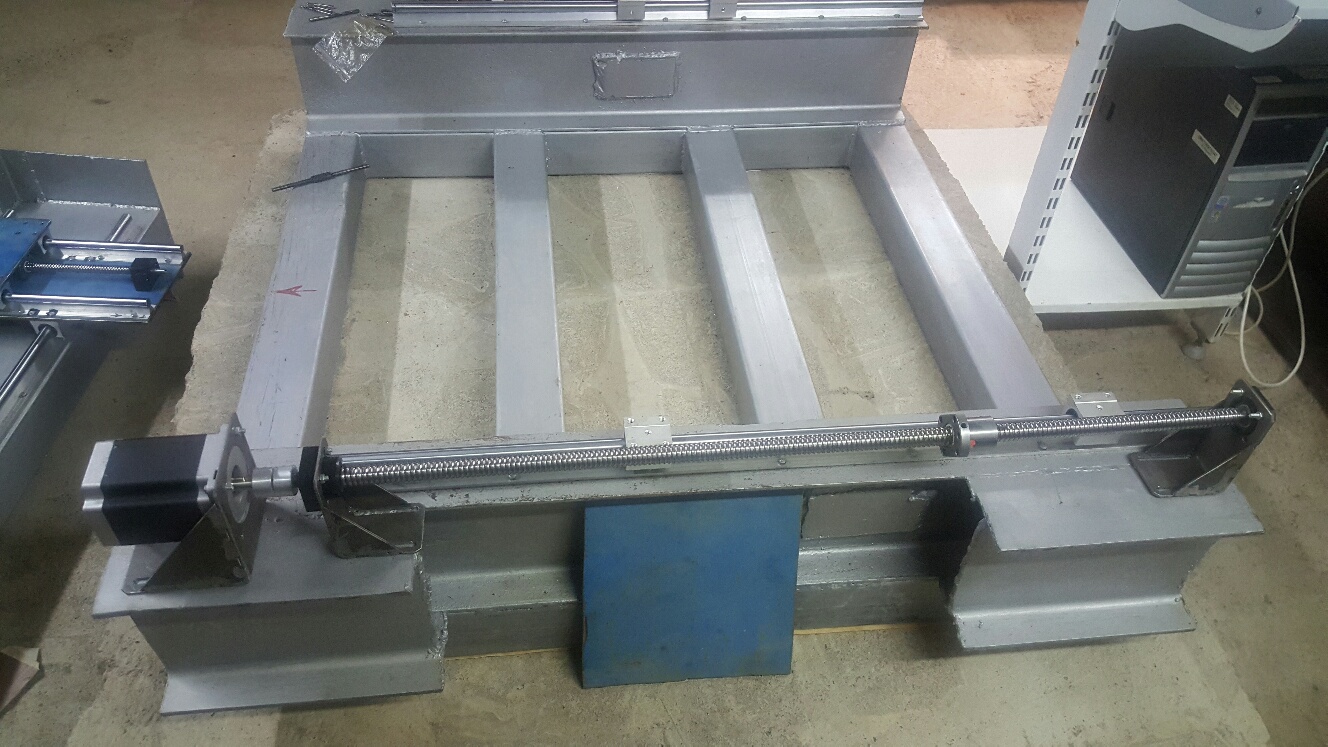 Вот фото моего станка. Рама сварена, как я писал ранее из профильной трубы и двутавра. Обжиг проводили на машиностроительном заводе, там же выравнивали плоскость: основание стола и посадочные места под рельсы. Портал сварен из стали 8мм и швеллера 30. Его также обжигали в печи и фрезеровали плоскости. Затем покраска. Установлен станок на основании залитом в подвале.