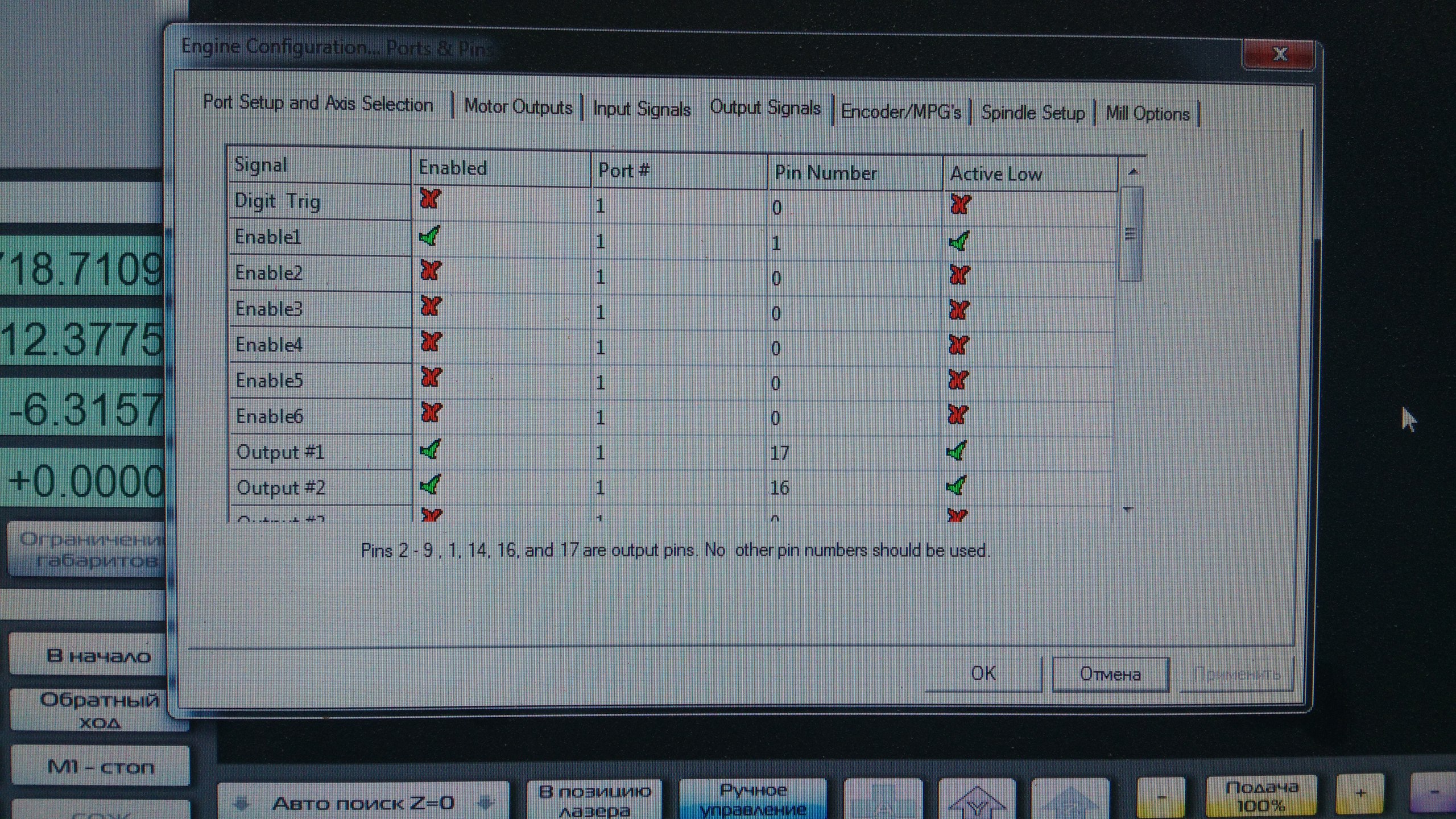 вот мои настройки мача, при них ПИН16 горит постоянно, оси двигаются, но вот шпиндель включаться перестал