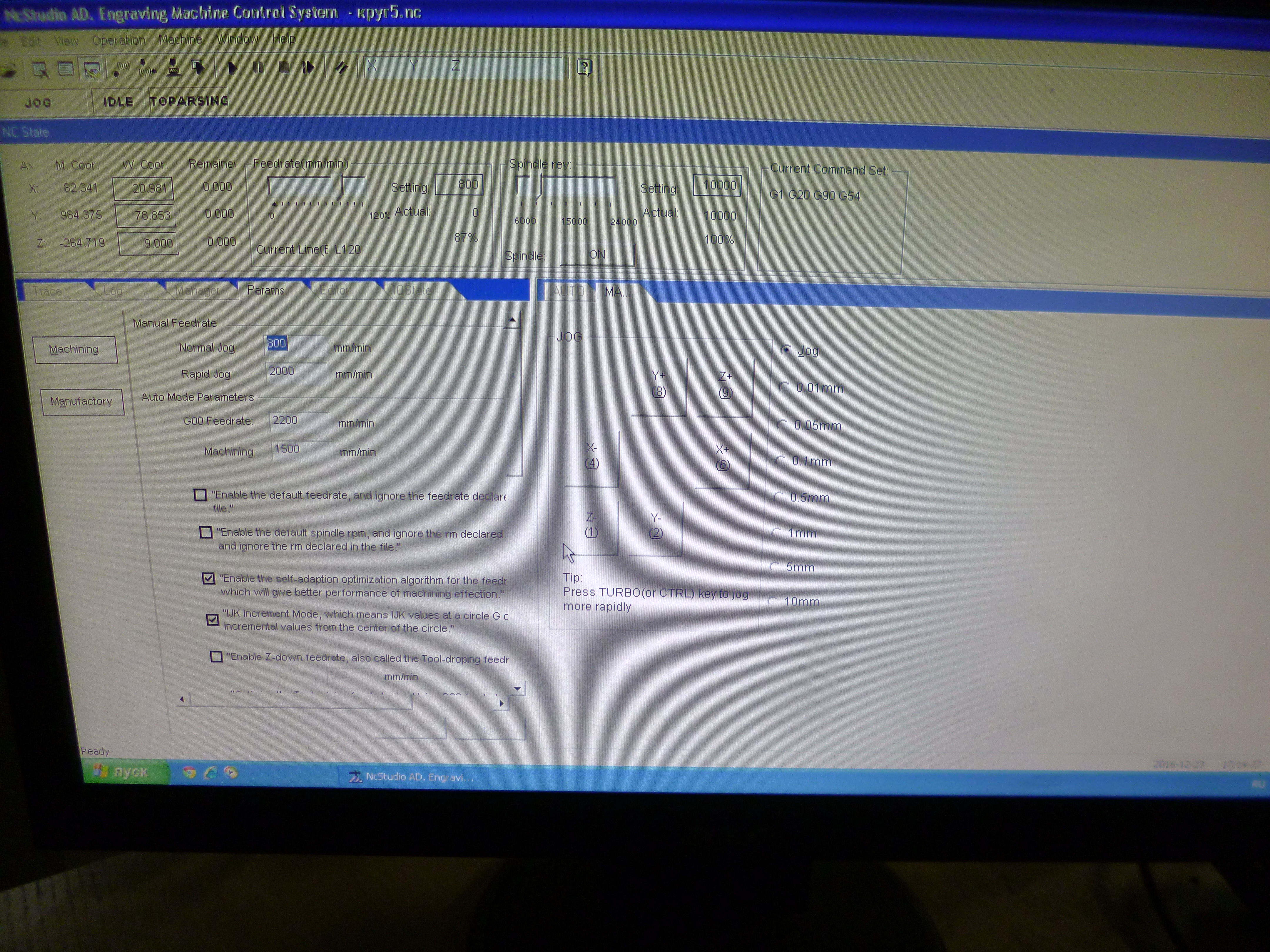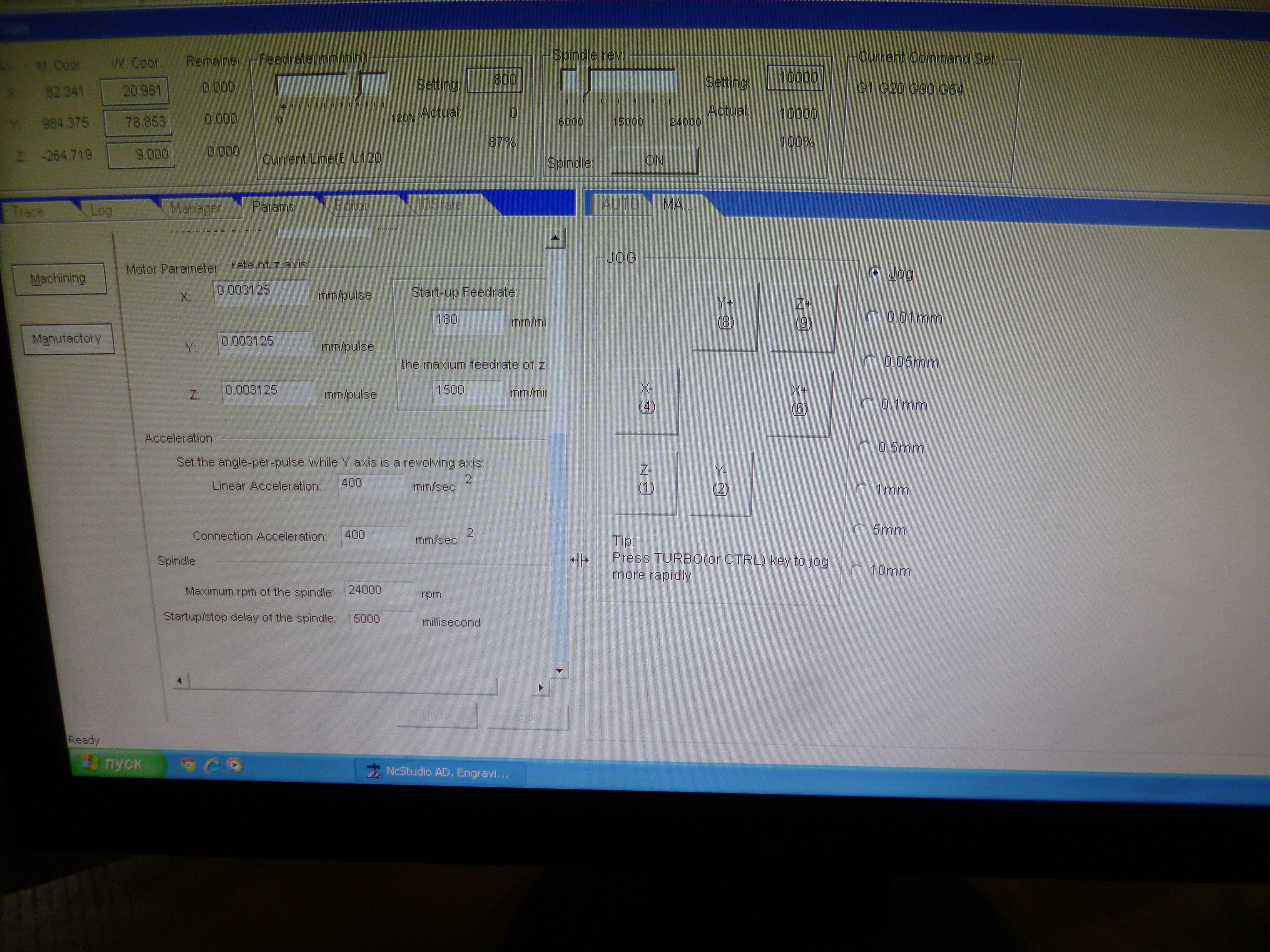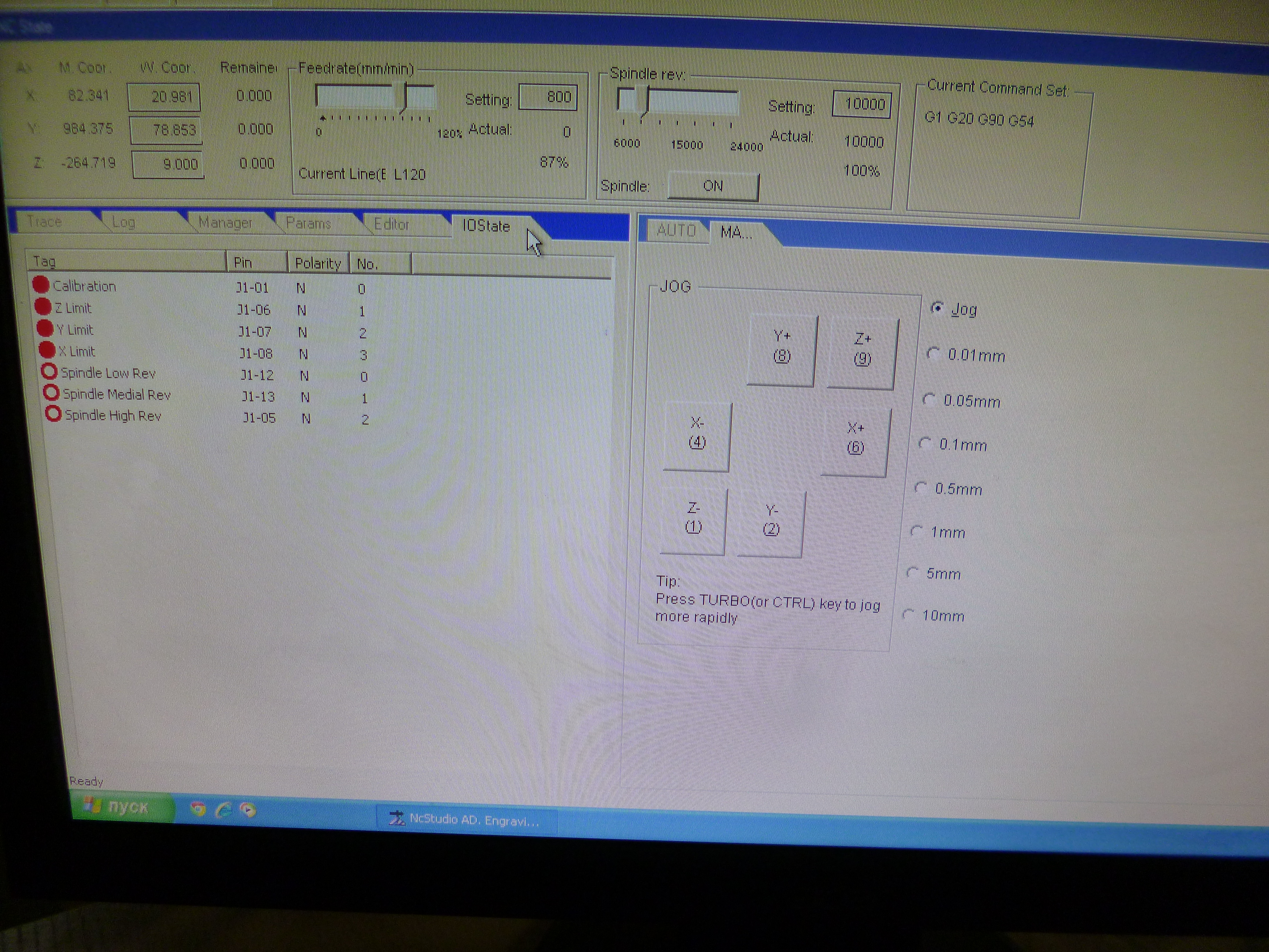 ПО NCstudio, не можем разобраться. На нулевые точки выходит, но при калибровке выносным датчиком до конца по оси Z не опускается, остается внизу около 30 см.