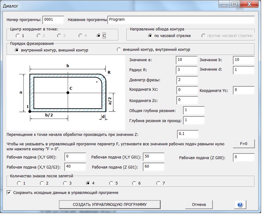 Например, вырез прямоугольного отверстия: задаем ширину, высоту, origin в центре или углу (с отображением на картинке), диаметр фрезы, обороты , подачу, толшину слоя, нажимаем "Создать" и получаем загруженный G-код.