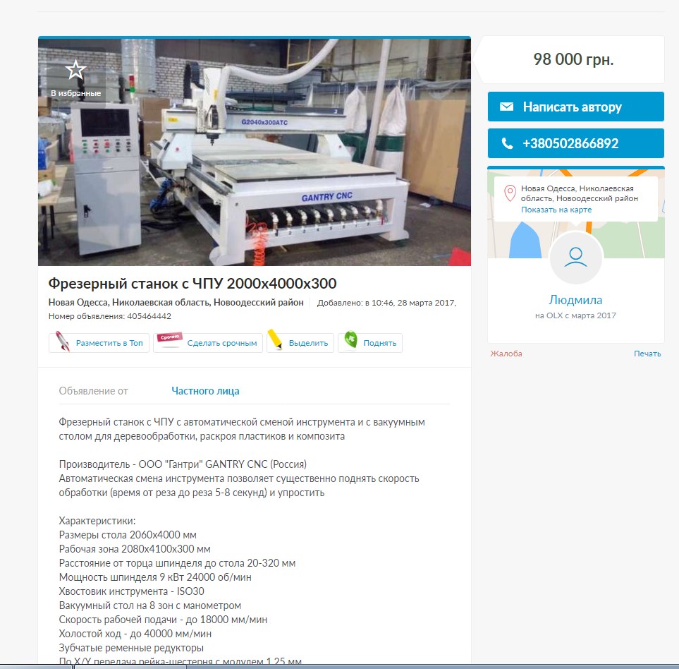 Самое смешное, что это объявление из очень маленького городка, в 20 км. от моего города (Николаев). Может мошенники получили доступ к запросам Гугл (у меня по станкам чпу в последний месяц было очень много таких запросов))))... Ну или второй вариант, это ПРОВИДЕНИЕ))... К сожалению наверно прощолкаю этот вариант, продавец говорит , что сегодня уже приедет покупатель на просмотр...
