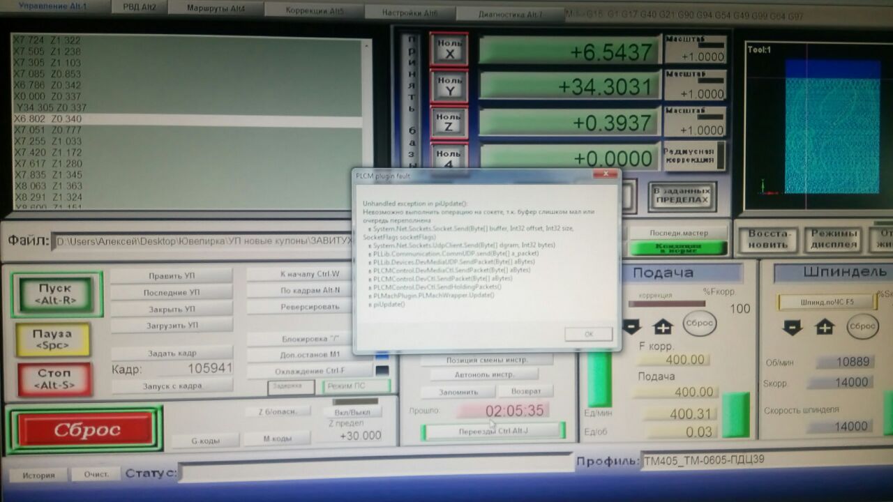 Всем доброго времени! Есть такая проблема. Во время фрезеровки часто вылетает такое сообщение: "Невозможно выполнить операцию на сокете так как буфер слишком мал или очередь переполнена....". Фрезеровка останавливается и все. Помогите пожалуйста решить проблему
