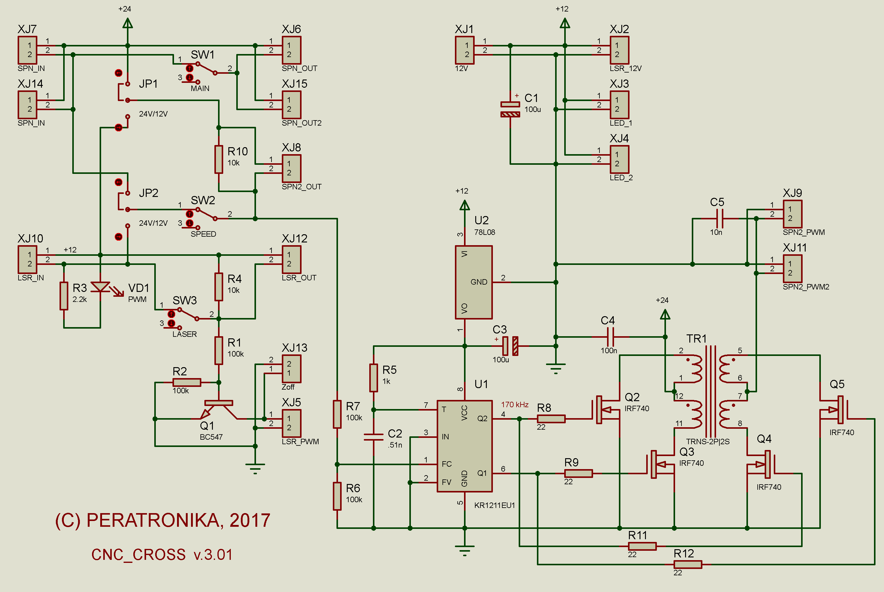 Здравствуйте! я недавно собрал 3018 на Woodpeaker-е, механика норм, а вот лазер работать никак не хотел. У меня на 5,5 Вт со своим контроллером. В конце концов я подключил его от доп. вывода 12 В и на +TTL снял с затвора транзистора laser out. Работает, но управление, не совсем правильное, т.е. нет максимума при вырезании. Пришёл к тому же выводу, что без доработки не обойтись. Хочу сделать что то наподобие CNC-Cross ver.1.01, но упростить оставить ШИМ и добавить доп. разъем для ДПМ и вентилятора, чтоб дым сдувал. Хотел уточнить, в вашей версии XJ10 подключается к Laser/Spindle, XJ14 - к Spindle, а куда XJ7? И ещё хотел уточнить назначение вывода XJ13 (Zoff). Да, и заземление у Вас в схеме нарисовано, откуда лучше взять? Вот, ещё чуть не забыл, я Woodpeaker-а перепрошил на grbl v.1.1f.... Прошу, отнестись к моим вопросам снисходительно поскольку только начинаю осваивать...