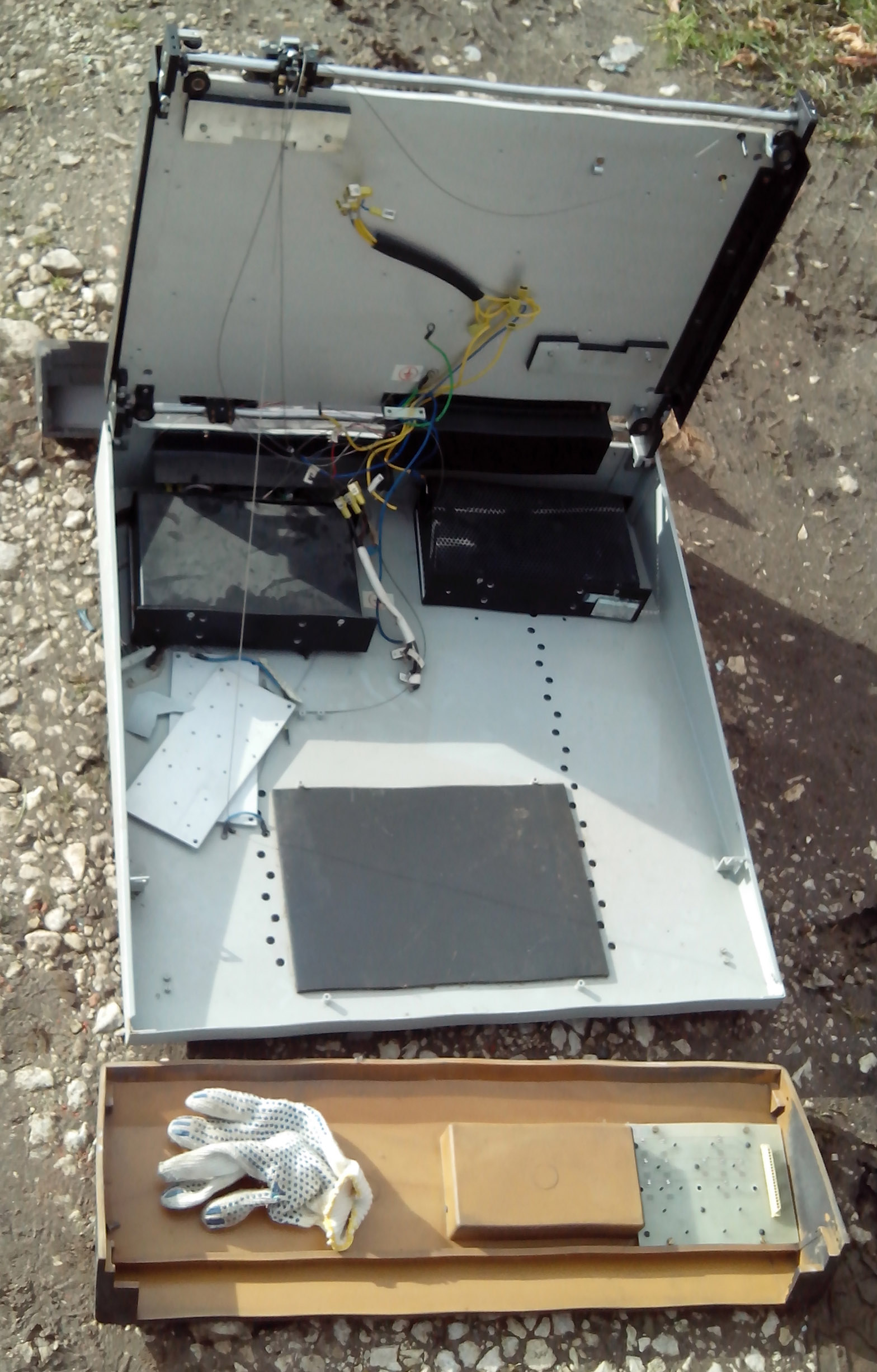 Механика от графопостроителя производства стран соцлагеря. Электроники и двигателей нет. Есть корпус, рама, столешница из толстой пластины алюминия, направляющие, каретка и стальные тросики. Все показано на фото.