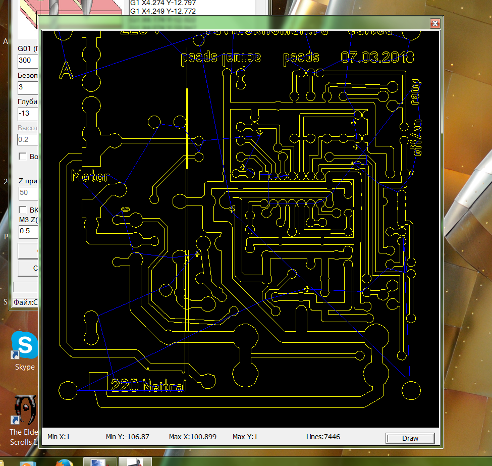 Здравствуйте . Я решил сделать регулятор для двигателя от стиралки . Нашёл файл в инете формата lay соответственно , скачал и загрузил в прогу Спринт Лаут соответственно , чтоб сгенерить файл для Степа , Всё проходит хорошо , Скинул В СтепКам и сгенерил УП . Всё хорошо . Но вот дошла очередь до МАЧа - загрузил УП и станок уезжает за рабочее поле станка ( спасают концевики ) . Почему то по оси Y ( основное по длине ) . По оси X этого не происходит . Я стал копаться в чём трабла и заметил в Спринт Лауте что координаты по Y стоят в минусовом значении , по X в плюсе . Так вот собственно вопрос - как в Спринт Лауте изменить начало координат на + по одной оси Y ? И это , я полагаю повлияет на " оборот " платы как то , или не повлияет ? Не понятно , однако . Собственно , есть способ простого смещения по полю проги просто чтоб координаты все были в плюсе , и всё . То есть исходник каким то образом был создан с одной координатой в минусе . Я при создании своего файла ( пришла идея фрезернуть ручку для ножовки из фанерки