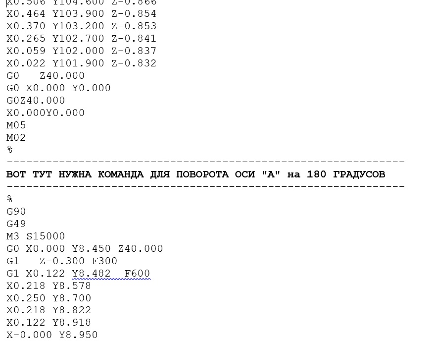 да я просто думал в блокноте удалить ненужные строки типа завершения работы, остановки шпинделя и т.д и добавить вращение оси А на 180 градусов.SVP писал(а):Склеить командой