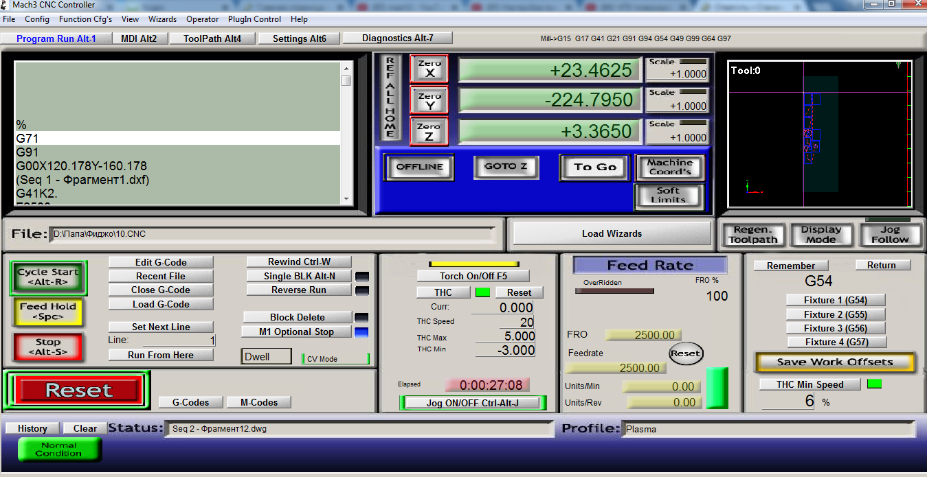 В чём проблема? Не могу найти настройку для опускания резака на металл, ось Z в УП не работает. Не знаю где это прописать. Привода по всем осям в ручном режиме работают нормально.