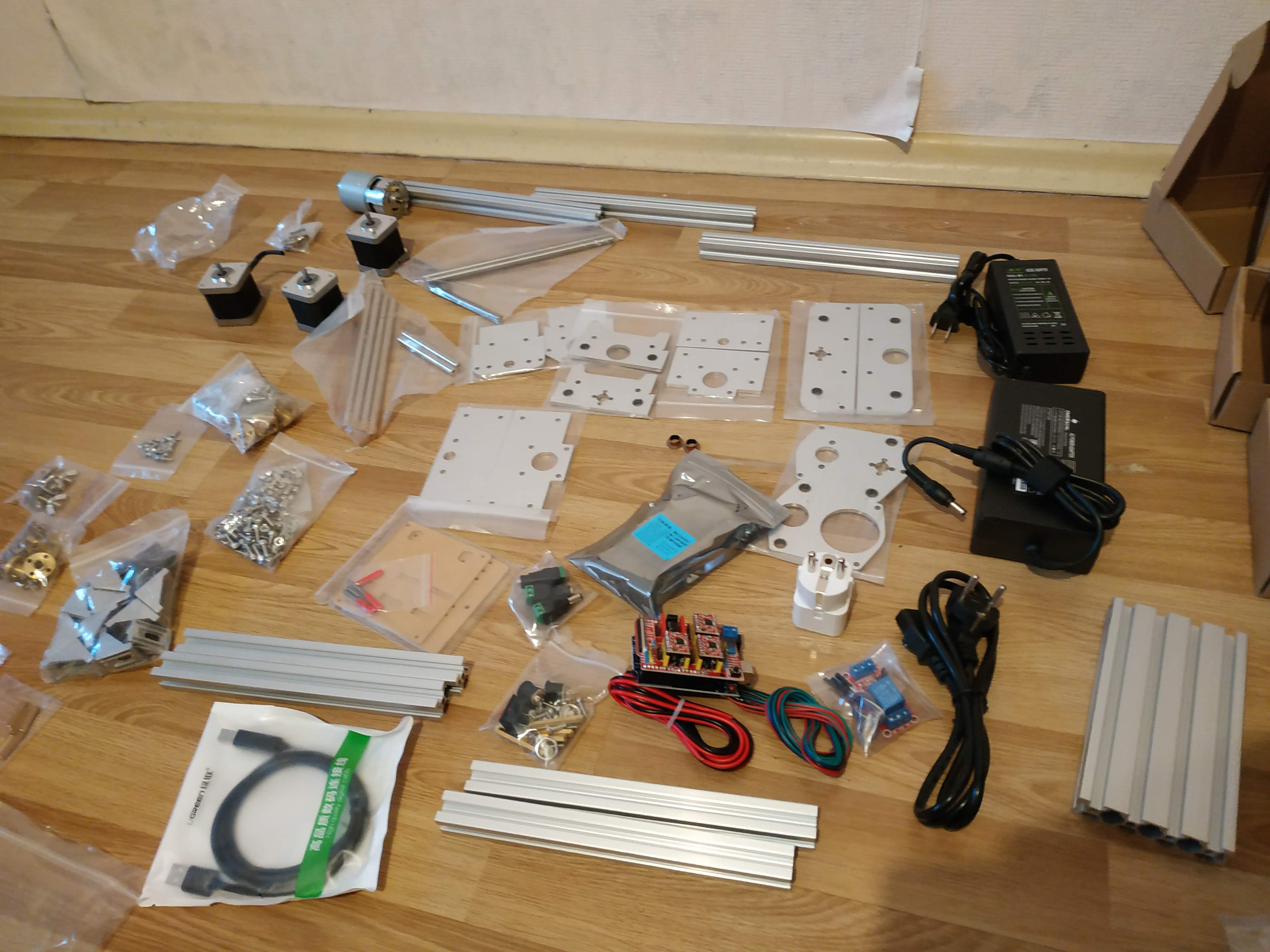 муфты, ходовые валы, напрявляющие, все что необходимо для сборки, ключи (набор почти самодостаточен, только для пайки нужен будет паяльник (половина соединений в электронике на зажимах))