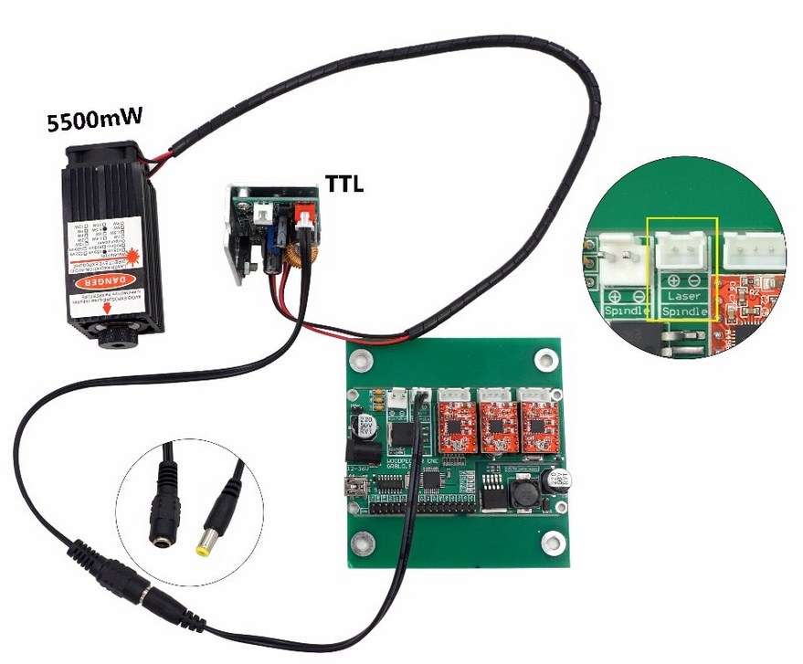 А этот вариант с управлением по TTL и отдельным блоком питания. Маломощный лазер питается от платы, мощный управляется через TTL.