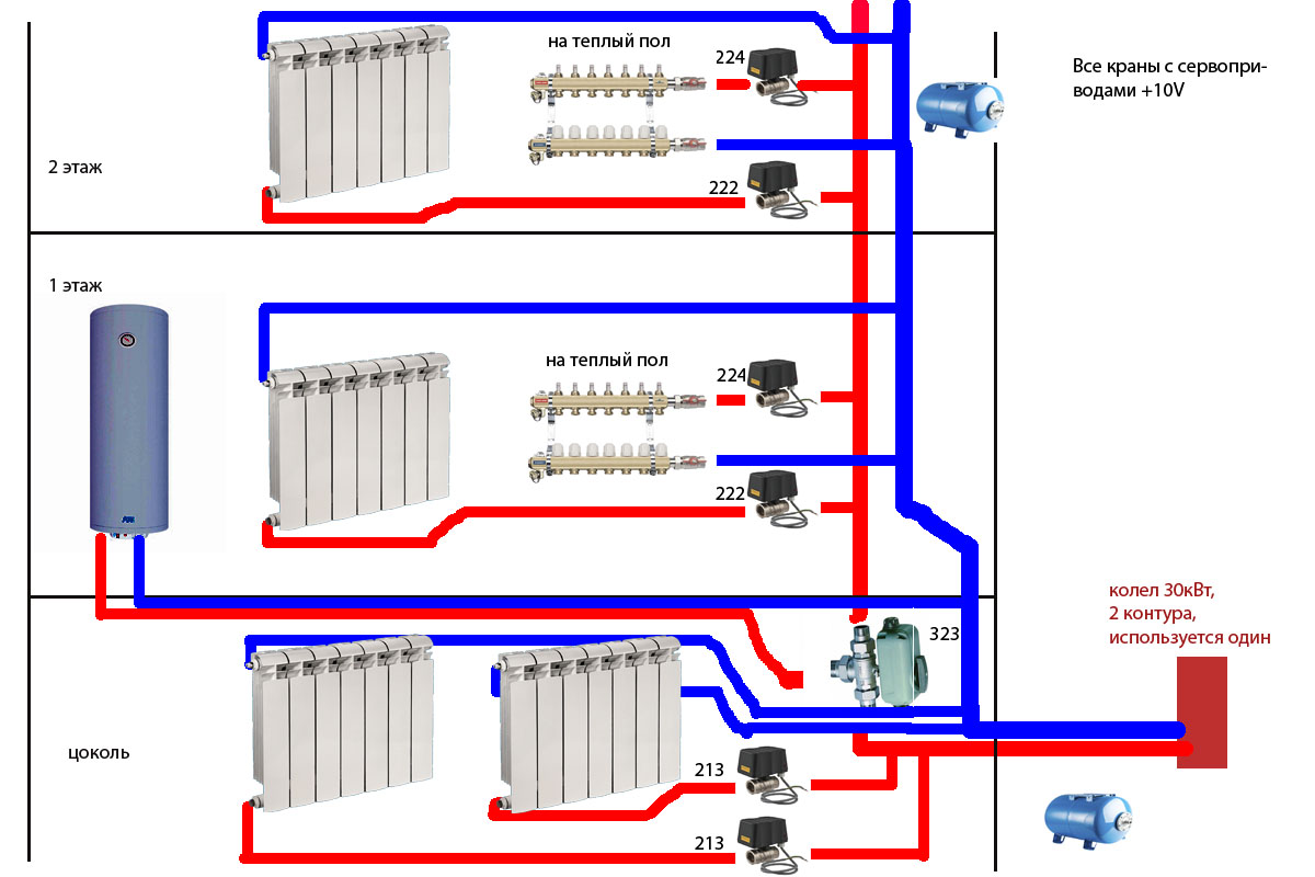 Строю дом, дошел до отопления. На картинке - схема разводки. Будут установлены 7 задвижек и вентилей, управляемых аналоговым сигналом +10V. Возможно, что-то еще добавлю.