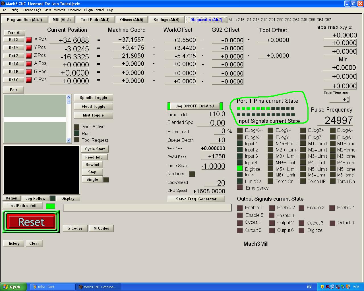 в расширителе нет. И в обоих случаях в диагностике ничего не приходит при замыкании z probe. А так же никогда не работала e stop кнопка. В режиме расширителя ругается на высокую частоту. Я поднимал частоту в мач, перепробовал все частоты, но это ничего не даёт.