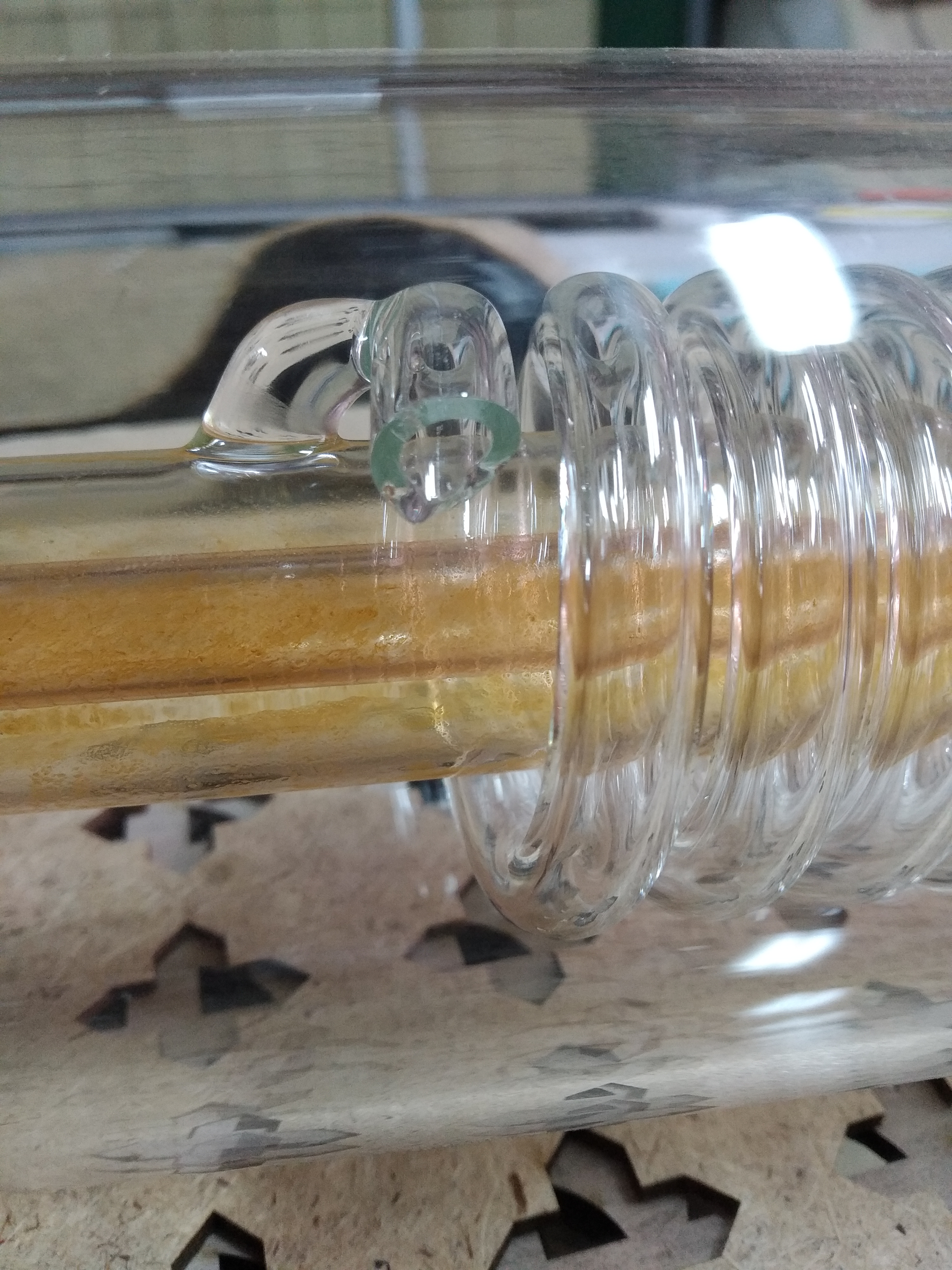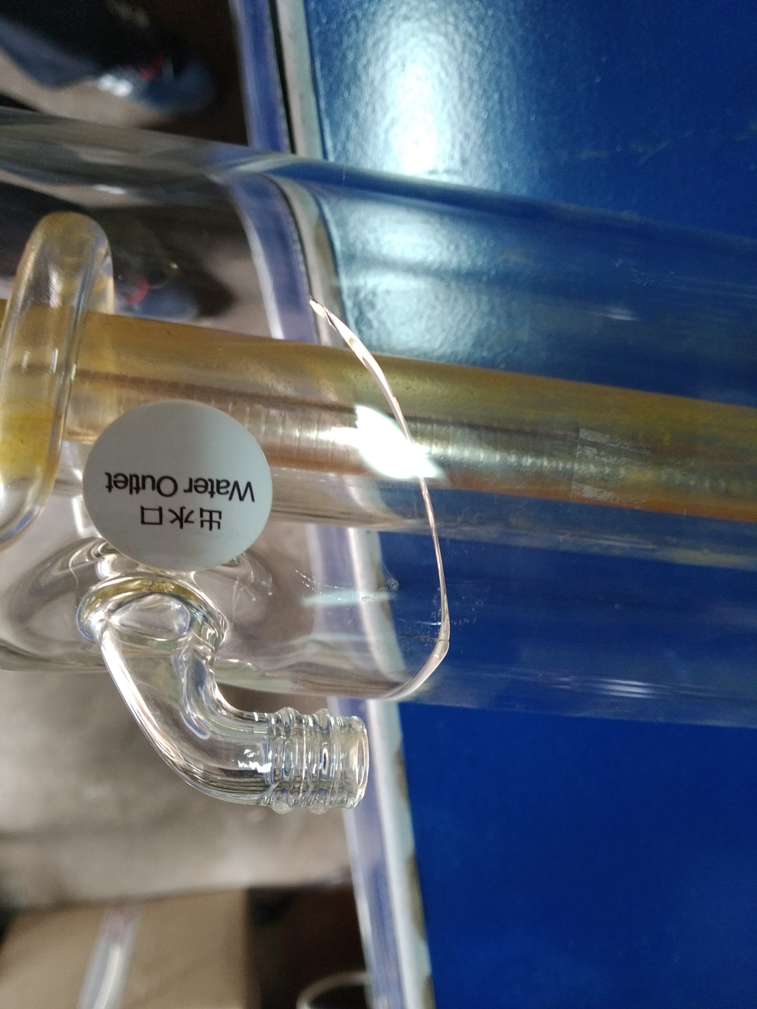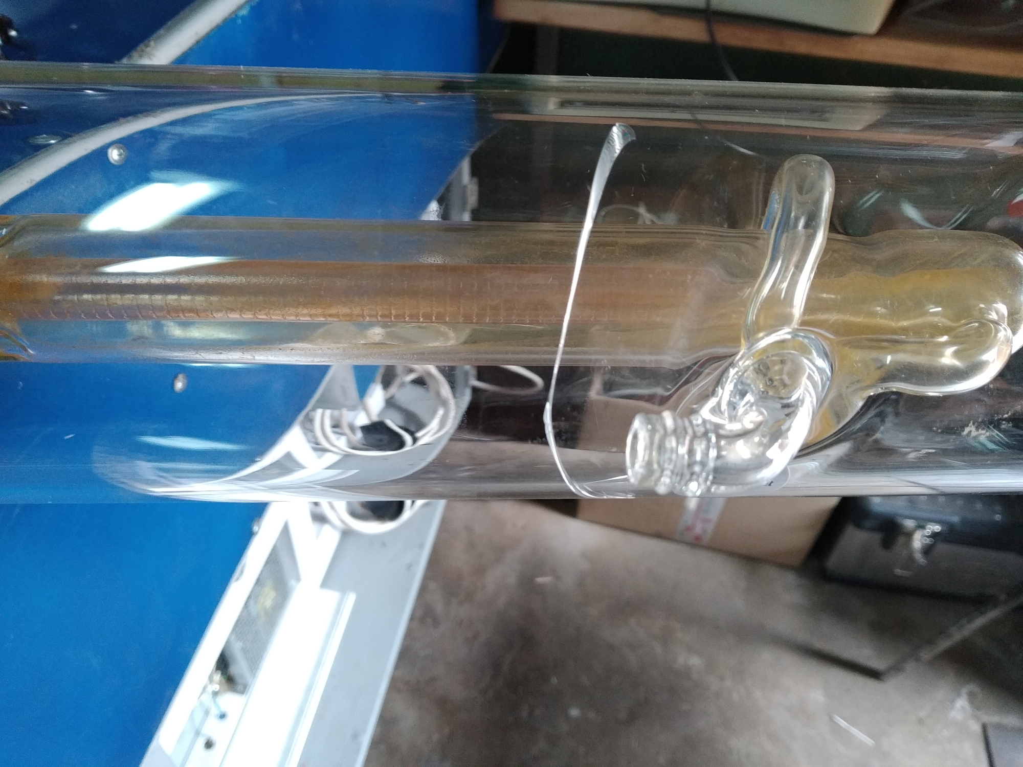 Примерно в июне этого года смонтировали трубку, запустили станок. Радости и гордости собой не было предела. Но не долго. Тестировали станок, дорабатывали, изучали ПО. В среднем станок запускали на пол-часа, час в день. И вот спустя пару недель, лазерный луч перестал исходить. Ошибок никаких не выдавало. Сначала начал грешить на ВПБ, но потом внимательно осмотрев трубку- увидел трещину.