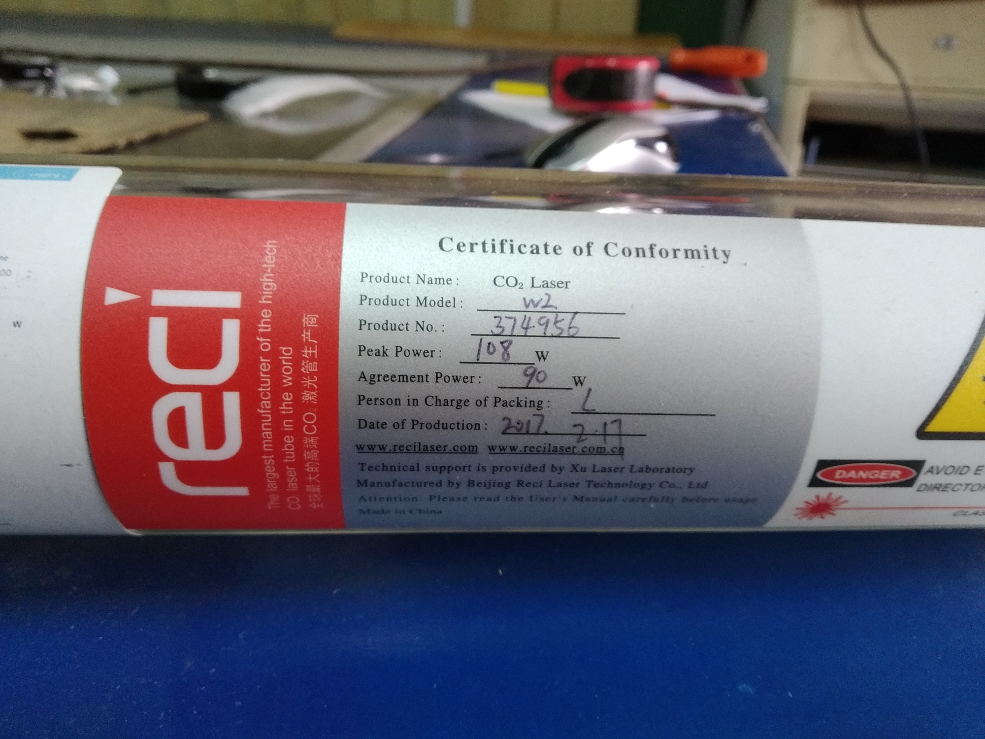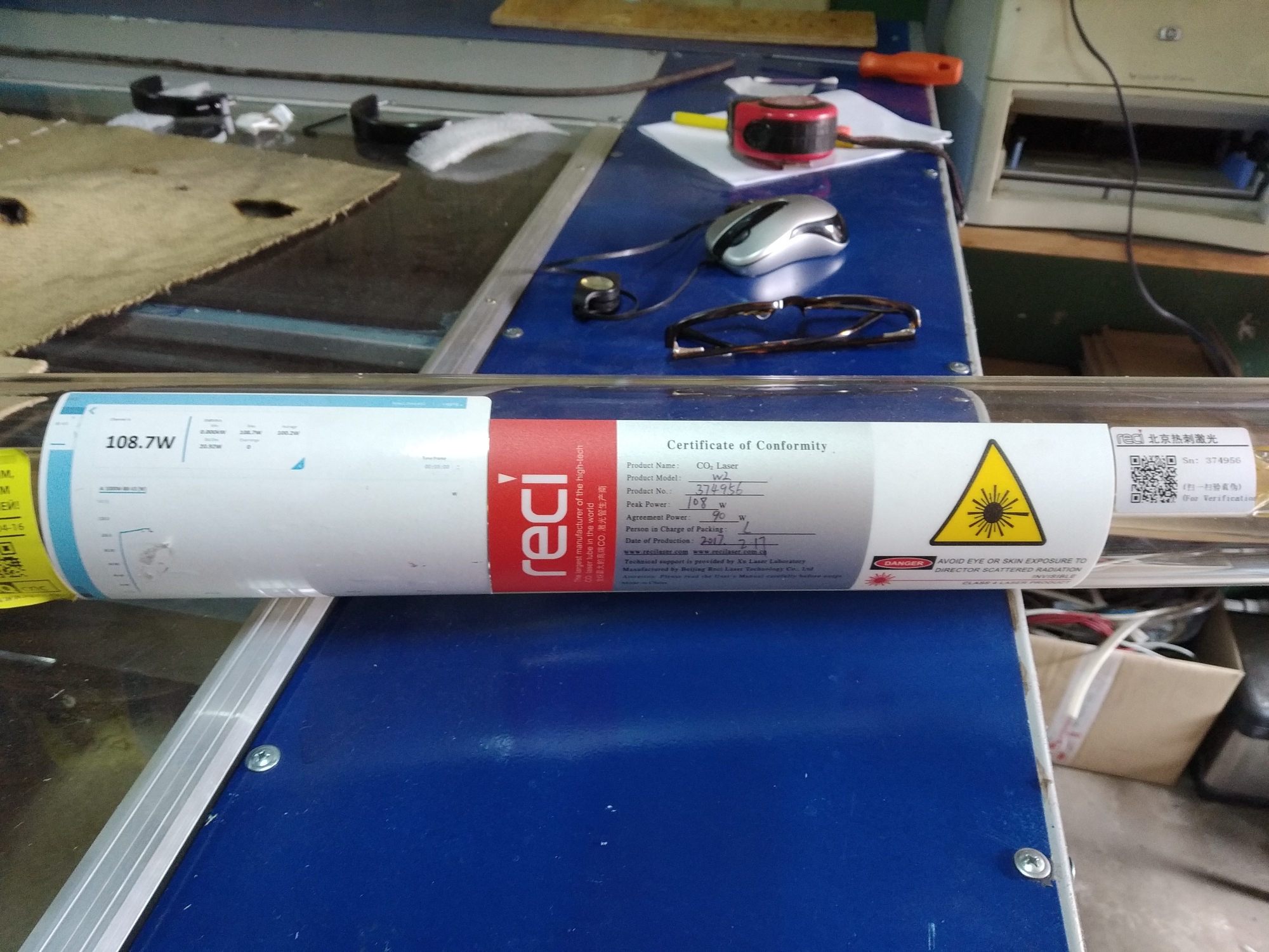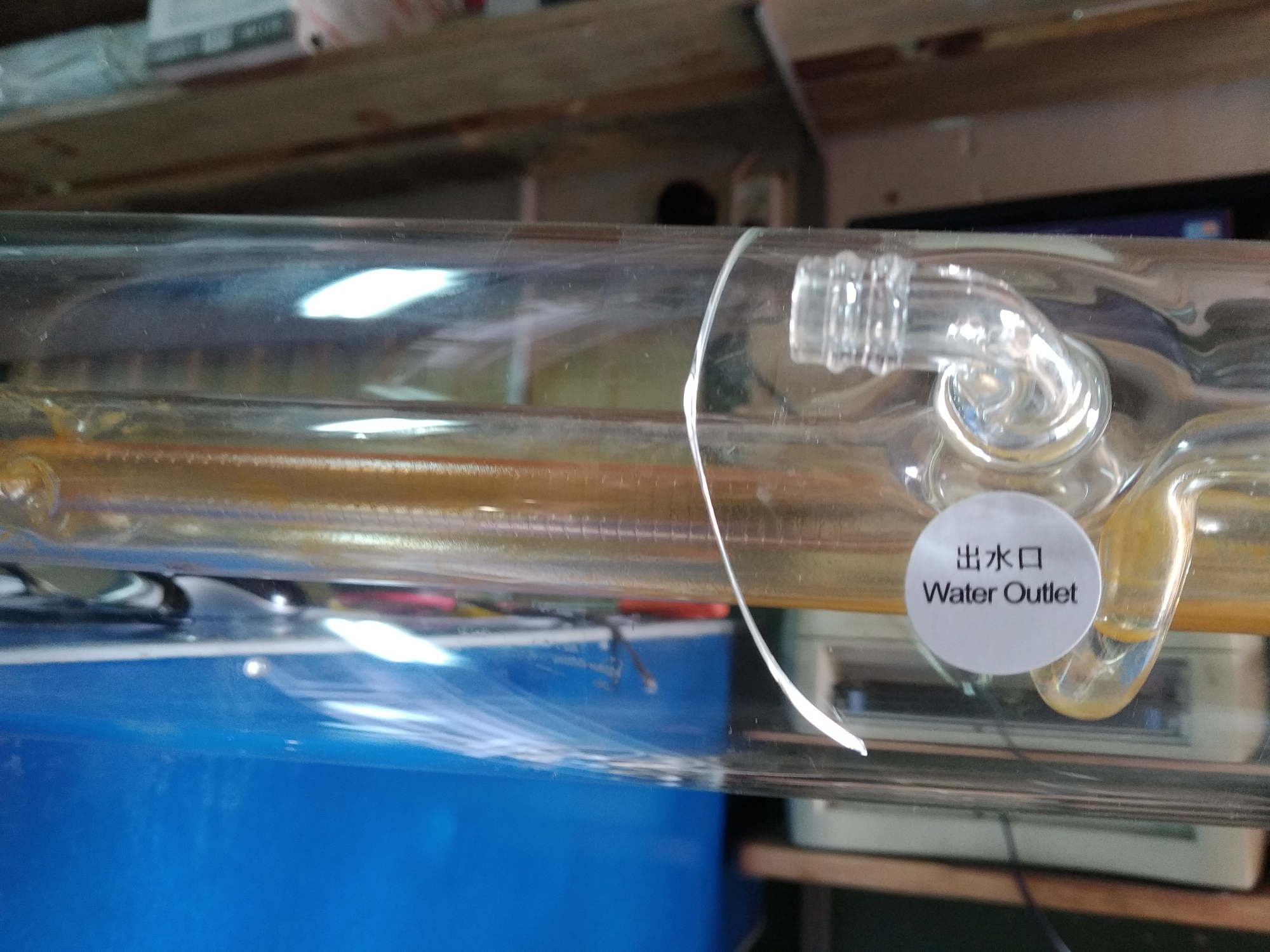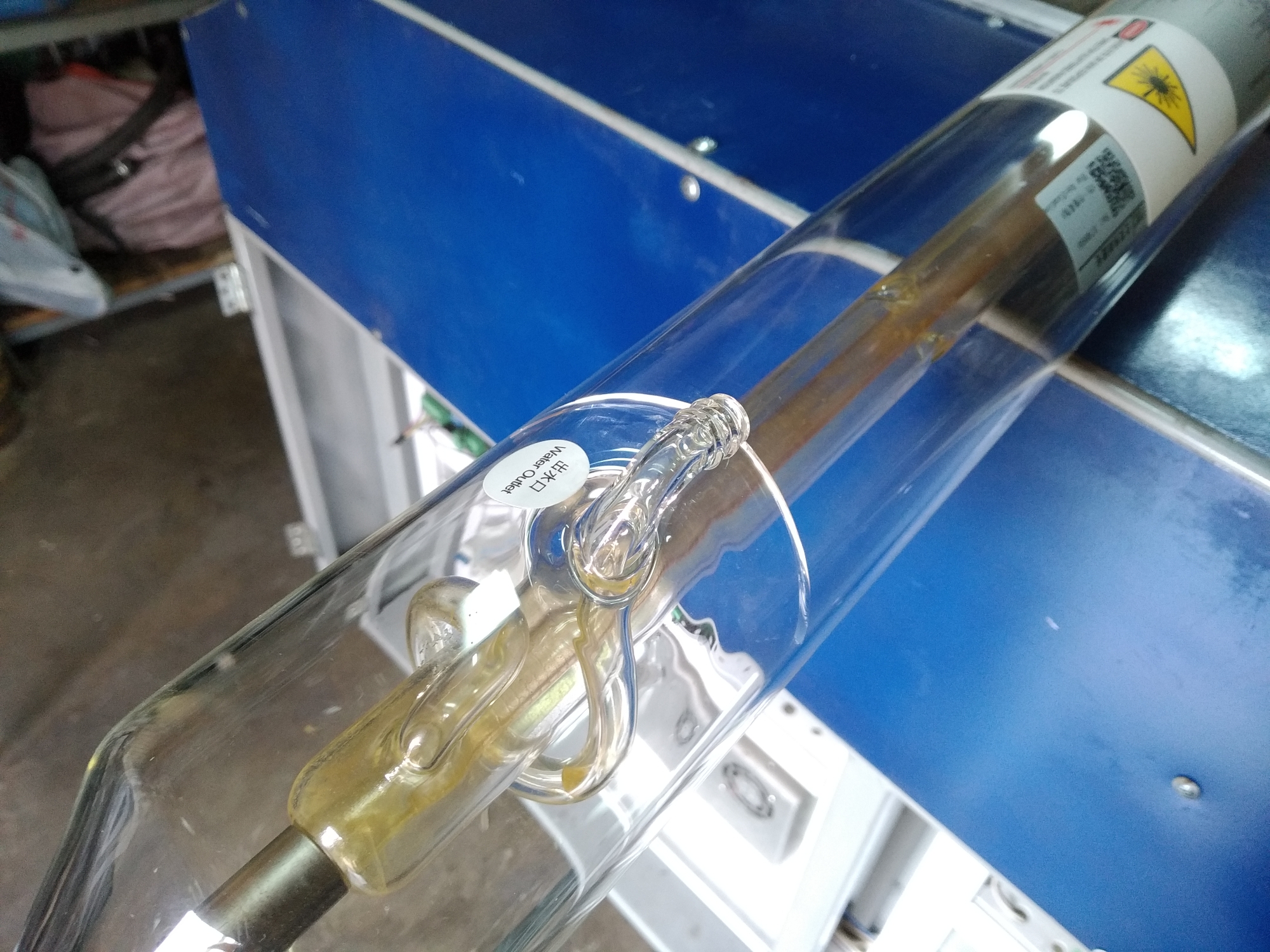 Примерно в июне этого года смонтировали трубку, запустили станок. Радости и гордости собой не было предела. Но не долго. Тестировали станок, дорабатывали, изучали ПО. В среднем станок запускали на пол-часа, час в день. И вот спустя пару недель, лазерный луч перестал исходить. Ошибок никаких не выдавало. Сначала начал грешить на ВПБ, но потом внимательно осмотрев трубку- увидел трещину.