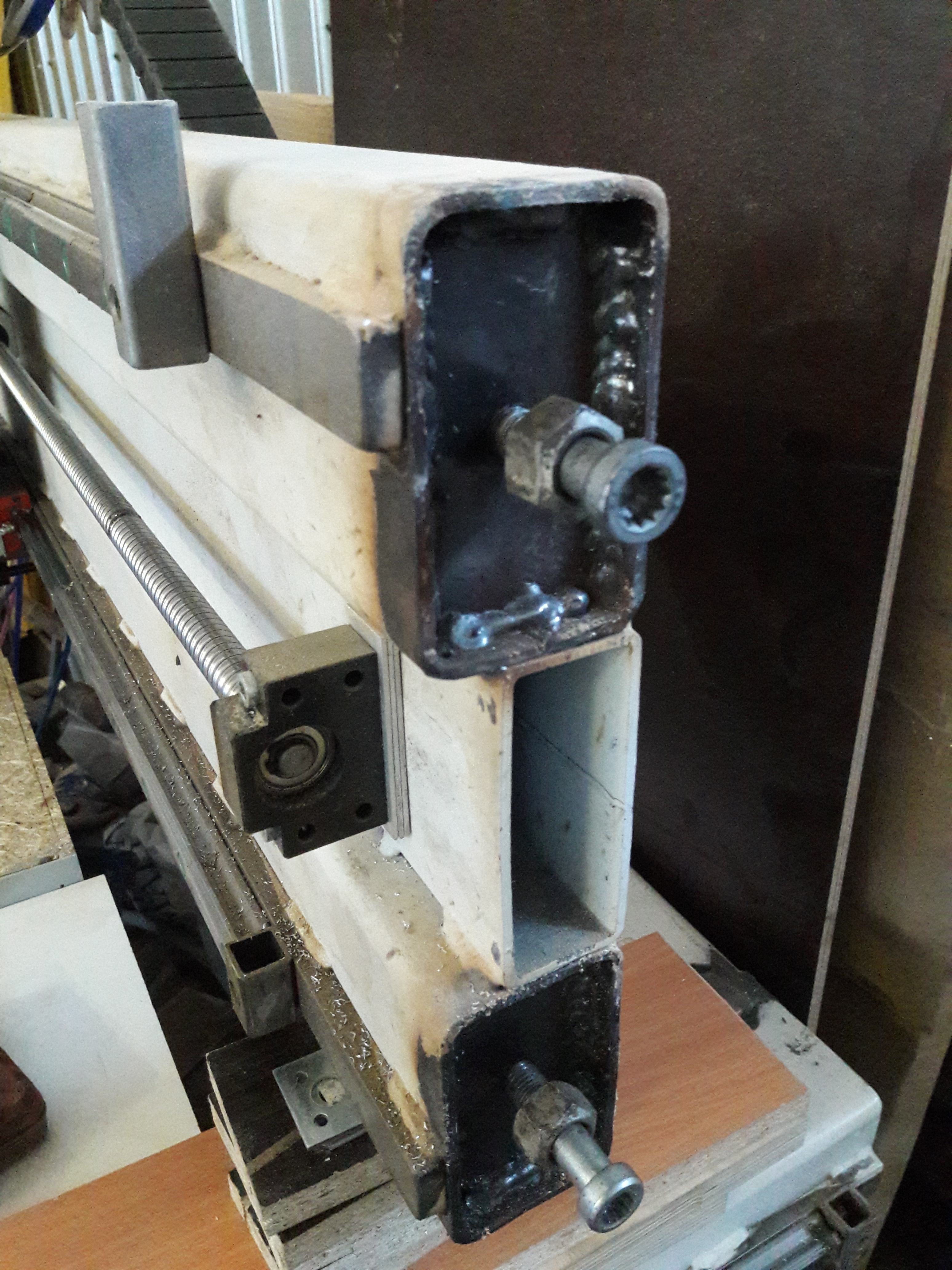 От стола до портала 205 мм ,но ход Z 240 мм (применена "обратная" схема установки кареток) это позволяет работать ниже стола ,передняя часть стола съёмная и весь стол не будет закреплён "насмерть",это даёт свои большие плюсы такие как размещение 4й оси например или обработка торцов метровых заготовок .Станина из трубы 100х100х4 ,балка 100х60 и 100х40.На столе будет сетка отверстий через 100 мм с гайкой м 8 снизу ,через них шпильками будет крепиться жертвенник и оснастка ,выравнивать буду только жертвенник ,есть червячный редуктор без люфта 1:24 и патрон 120 мм на 4ю ось ,но это позже.