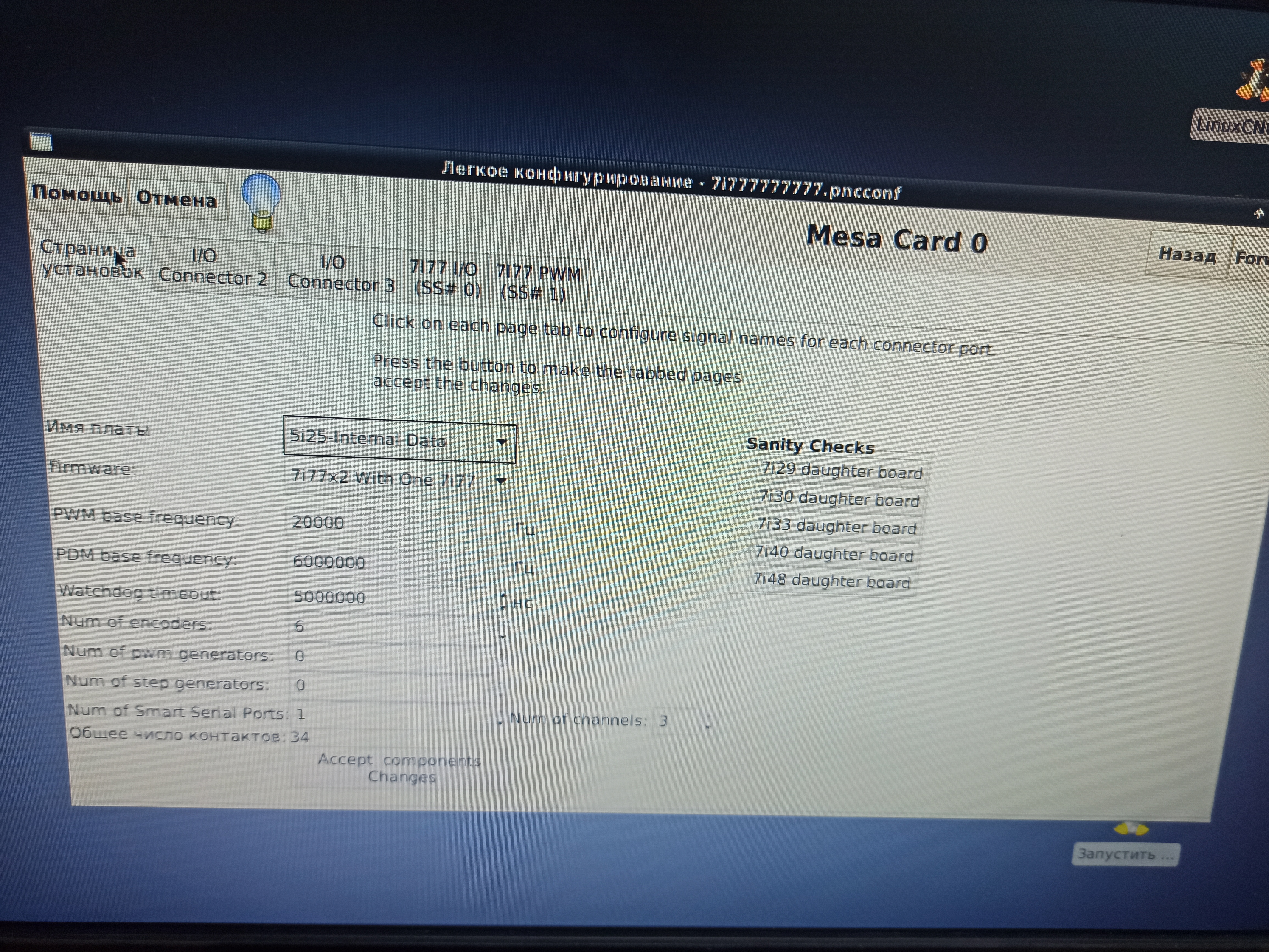 Тема заезженная, но не получается подключить плату 7i76 к 5i25. Форумы читал, перемычки менял...как я понимаю, просто 5i25 не обнаруживает 7i77.