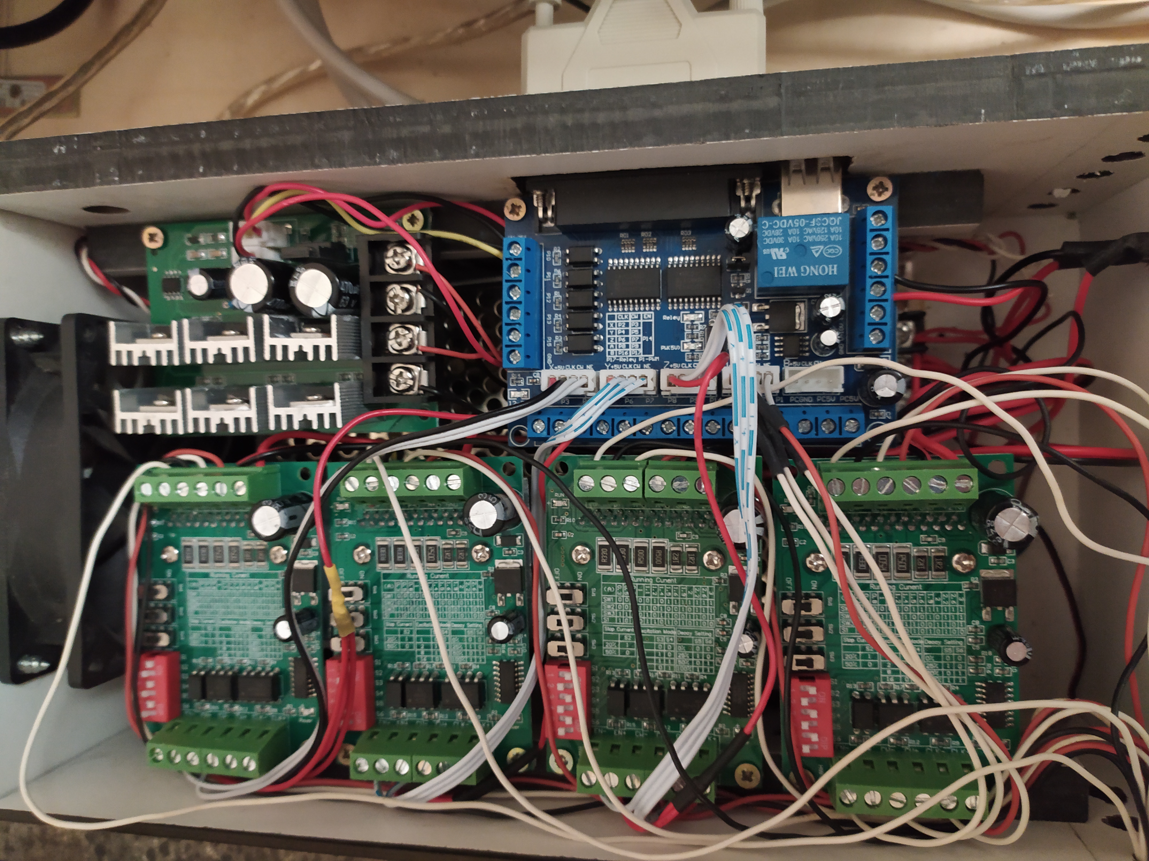 Доброго времени суток! У меня самодельный станок на плате mach3 синяя на фото. Драйвера ТВ6550. Управление через LPT, winXP sp2. Проблема в том что иногда все оси кроме оси А едут в одну сторону, хоть в плюс, хоть в минус нажимаю. В связи с этим при работе по программе иногда оси едут не туда и сбиваются координаты в минус вместо плюса