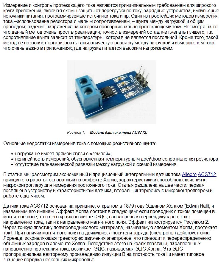 Я имел дело с датчиками тока ACS712. Очень удобная и точная штучка, есть на разный ток 10/20/30А, на выходе выдает линейное напряжение до 5В в зависимости от тока. Я использую в стопе автоматики ворот, увеличение тока мотора напряжением 80В при защемлении машины/кота/снега.ex71 писал(а):Может какие-то готовые девайсы есть?