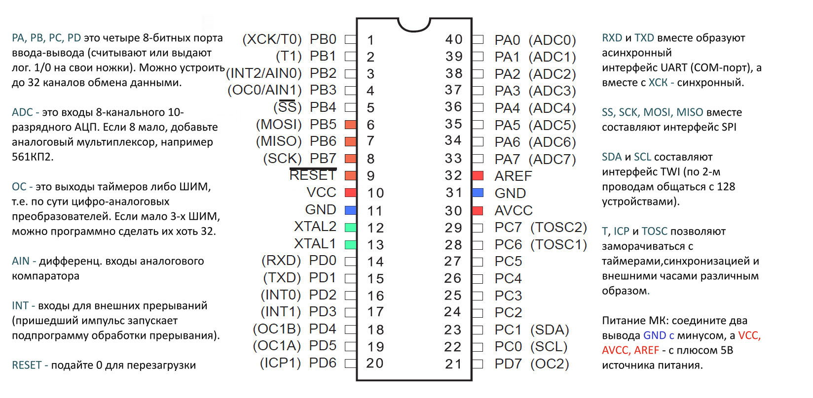 На работе на компьютере была картинка Atmega8535, на которой по русски подписаны дополнительные функции выводов.