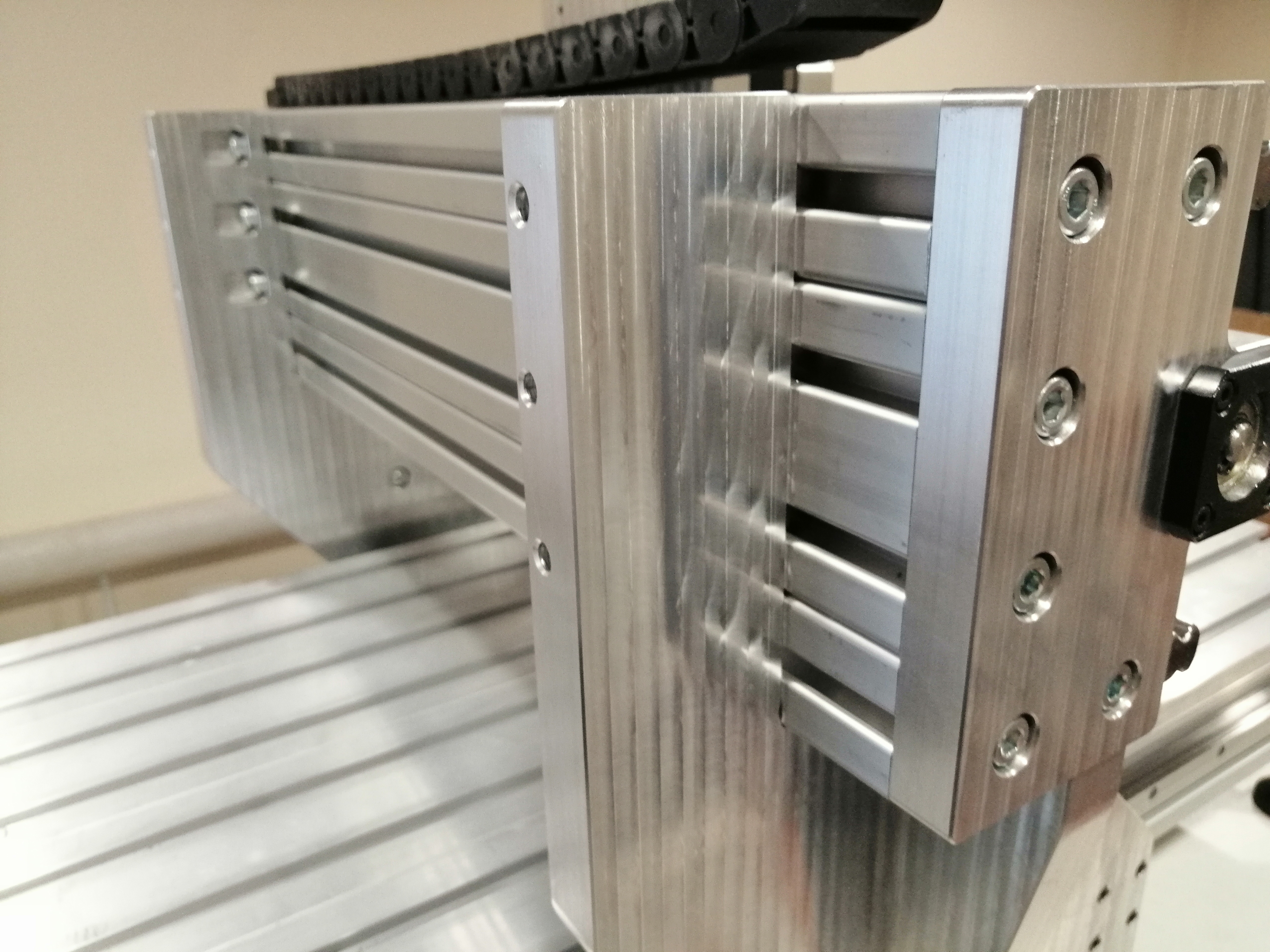 Кстати, жесткость получилась вполне приемлемая на не самом мощном профиле (толщина стенки 4,5 мм) Вдоль портала 0,05 мм на 20 кг, вдоль стола по середине 0,04 мм на 20 кг, с края 0,05 мм на 20 кг.