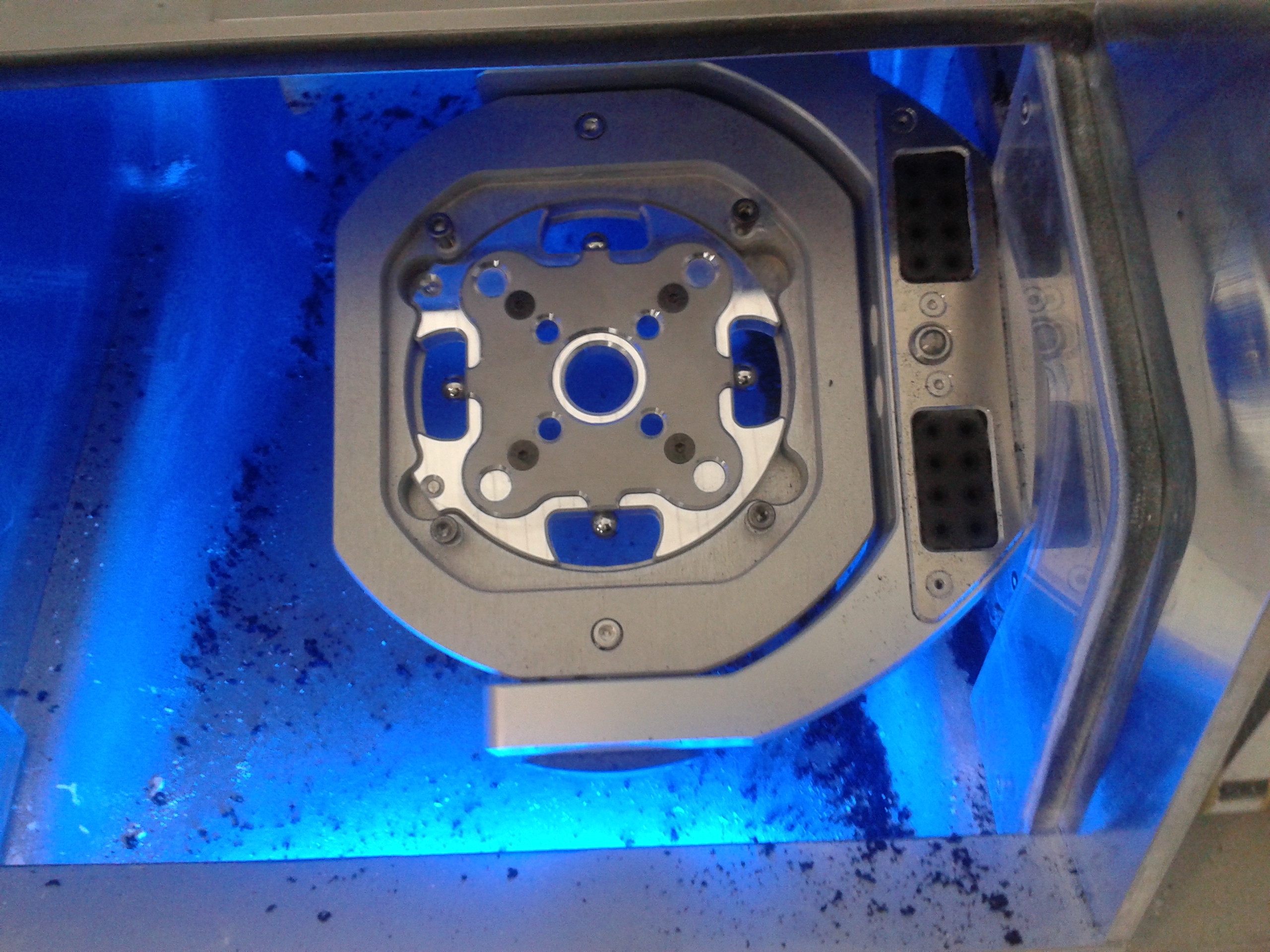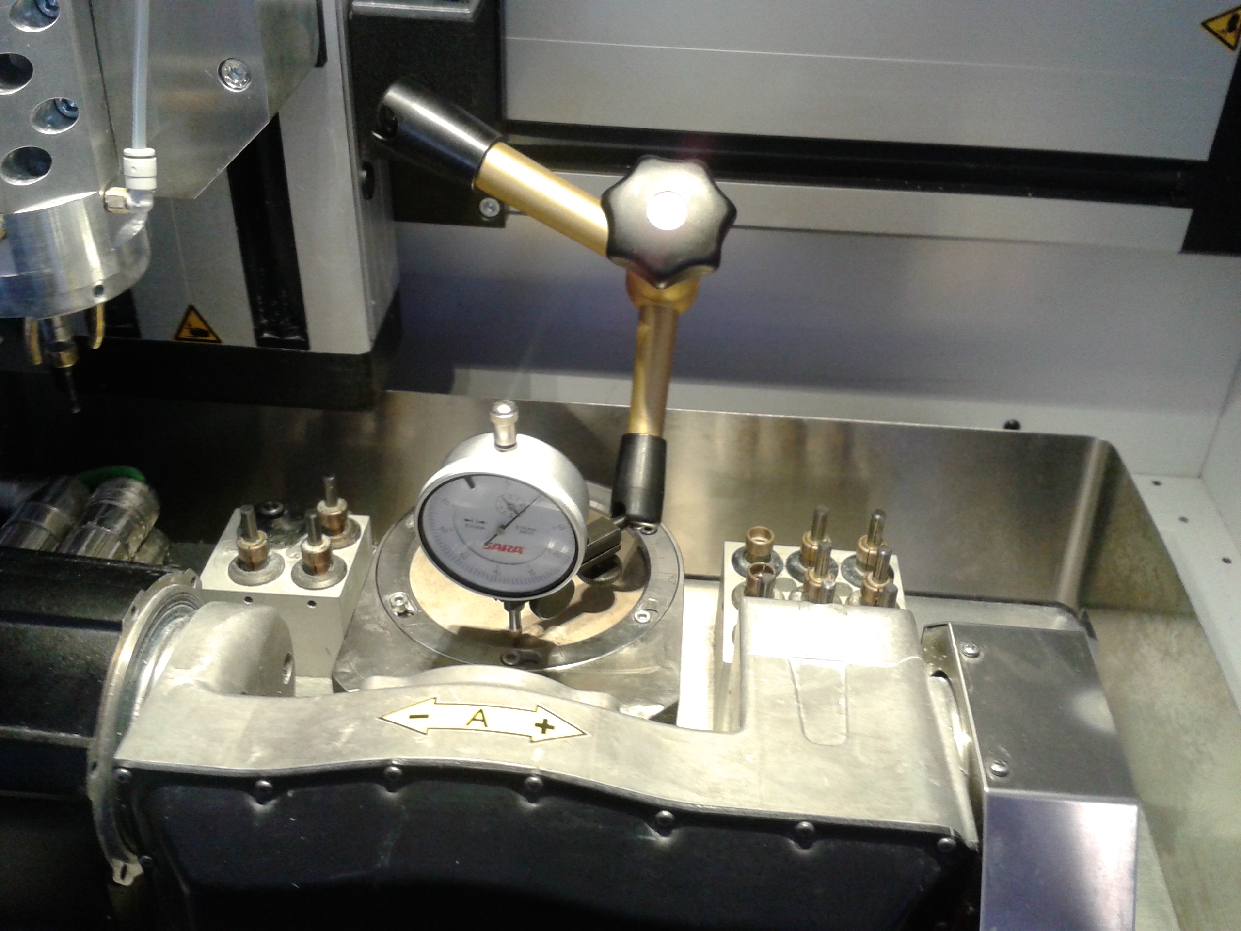 Калибровка маленького станка идет с помощью специального калибровочного устройства. Специальный калибровочный пин вставляется в шпиндель, потом ходит по шарам на калибровочном устройстве, при этом оси двигаются и пр. В результате нужно поставить вместо диска устройство, калибровочный пин и просто нажать кнопку, прога все сделает сама.